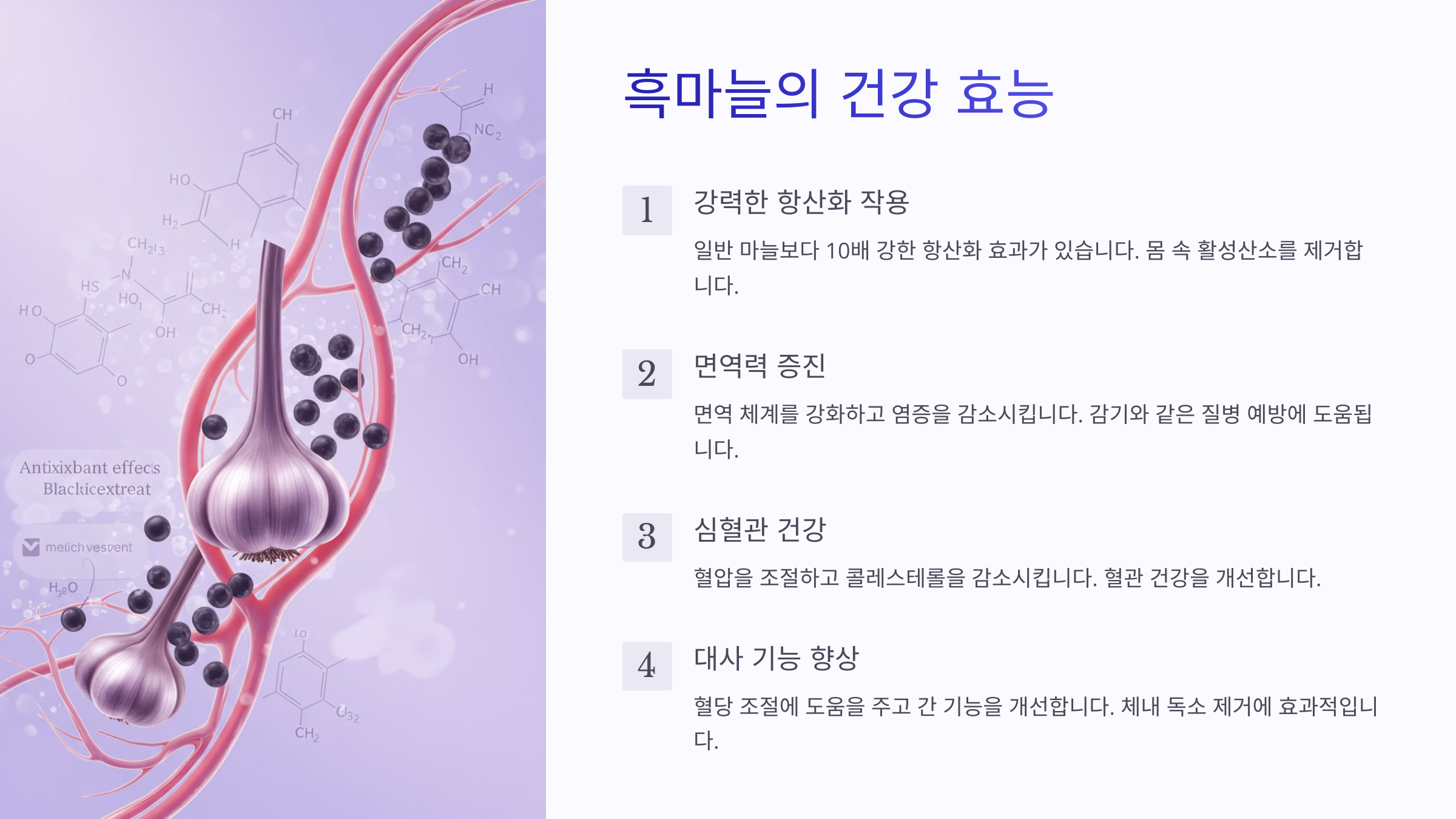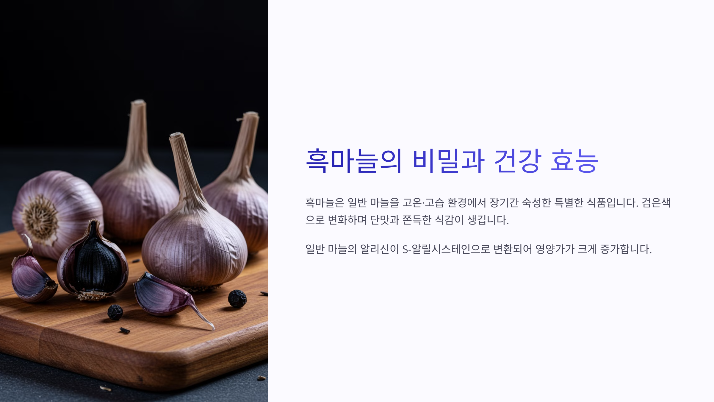 📢 다음 섹션에서는 흑마늘이 우리 몸에 어떤 효능을 주는지 알아볼게요!