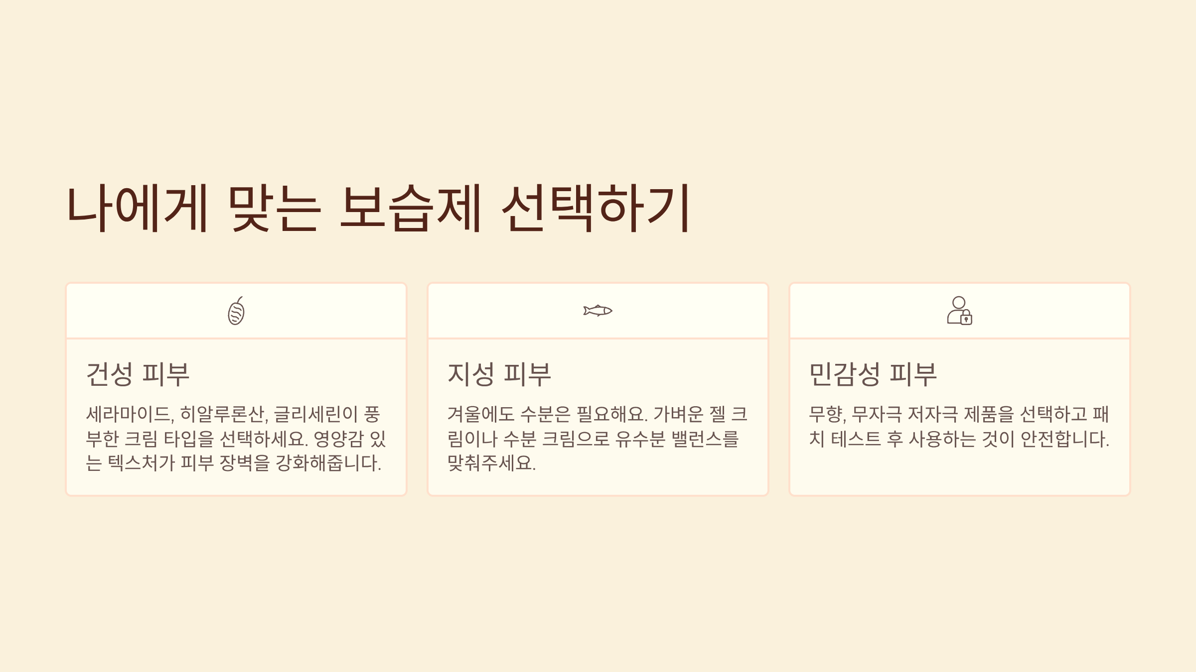 겨울철 보습제 선택은 피부 타입에 따라 달라져요. 건성 피부라면 세라마이드, 히알루론산, 글리세린이 풍부한 크림 타입을 선택하는 게 좋아요. 지성 피부도 겨울에는 수분이 부족할 수 있으니 가벼운 젤 크림이나 수분 크림을 사용해보세요.