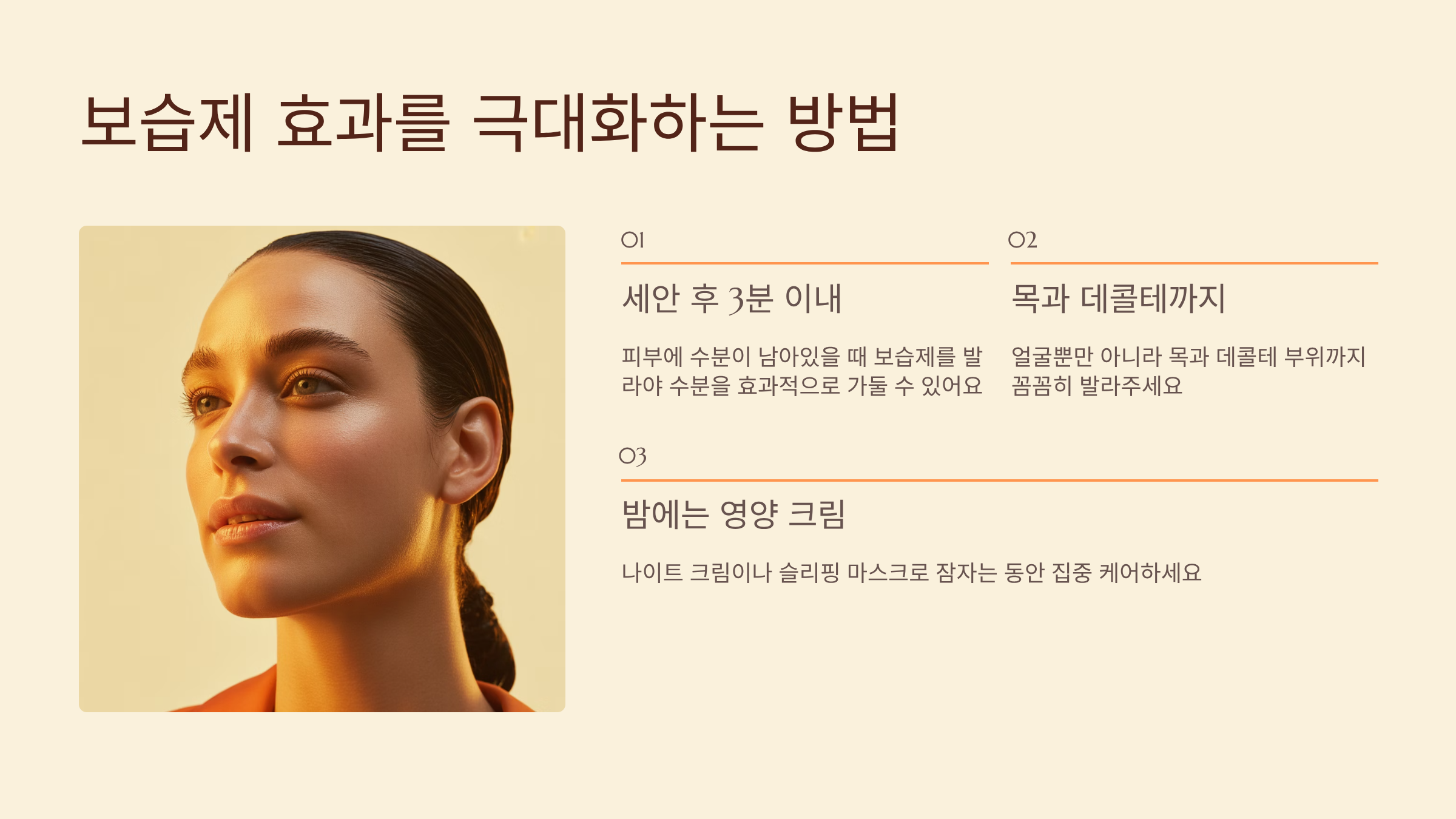 보습제는 세안 후 3분 이내에 바르는 것이 가장 효과적이에요. 피부에 수분이 남아있을 때 보습제를 발라야 수분을 가두는 효과가 있거든요. 얼굴뿐만 아니라 목과 데콜테 부위까지 꼼꼼히 발라주는 것도 잊지 마세요.