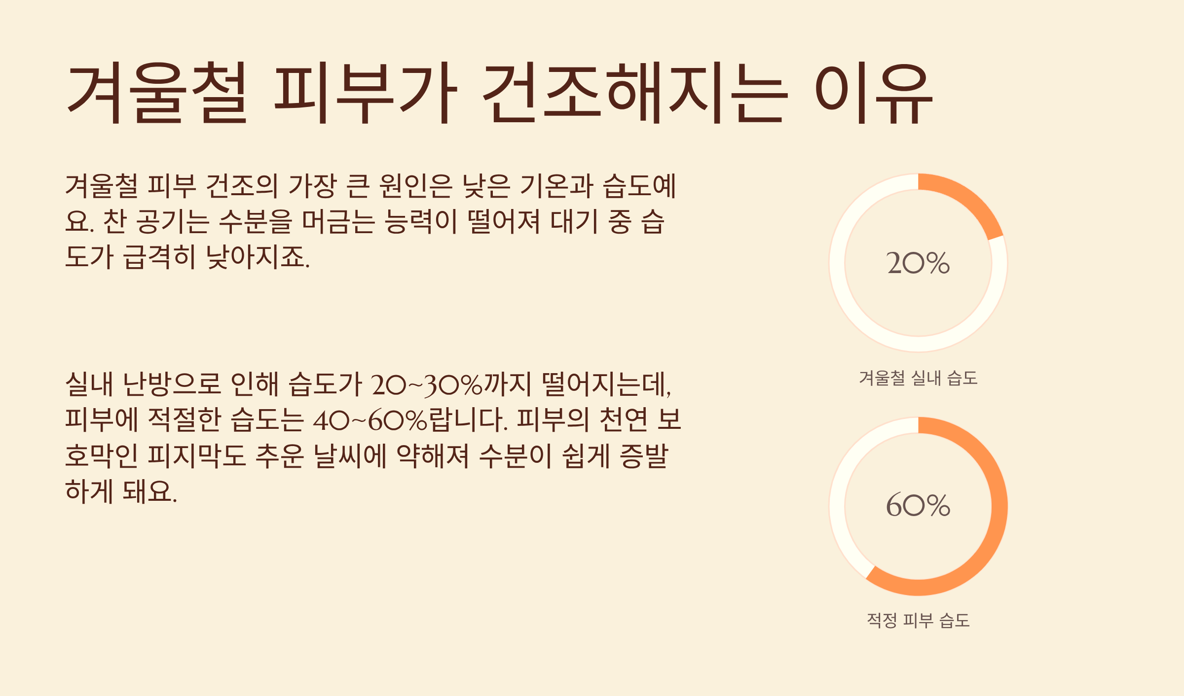 겨울철 피부 건조의 가장 큰 원인은 낮은 기온과 습도예요. 찬 공기는 수분을 머금는 능력이 떨어져서 대기 중 습도가 급격히 낮아지게 되죠. 실내에서는 난방기구 사용으로 인해 습도가 20~30%까지 떨어지는데, 피부에 적절한 습도는 40~60%라고 해요.