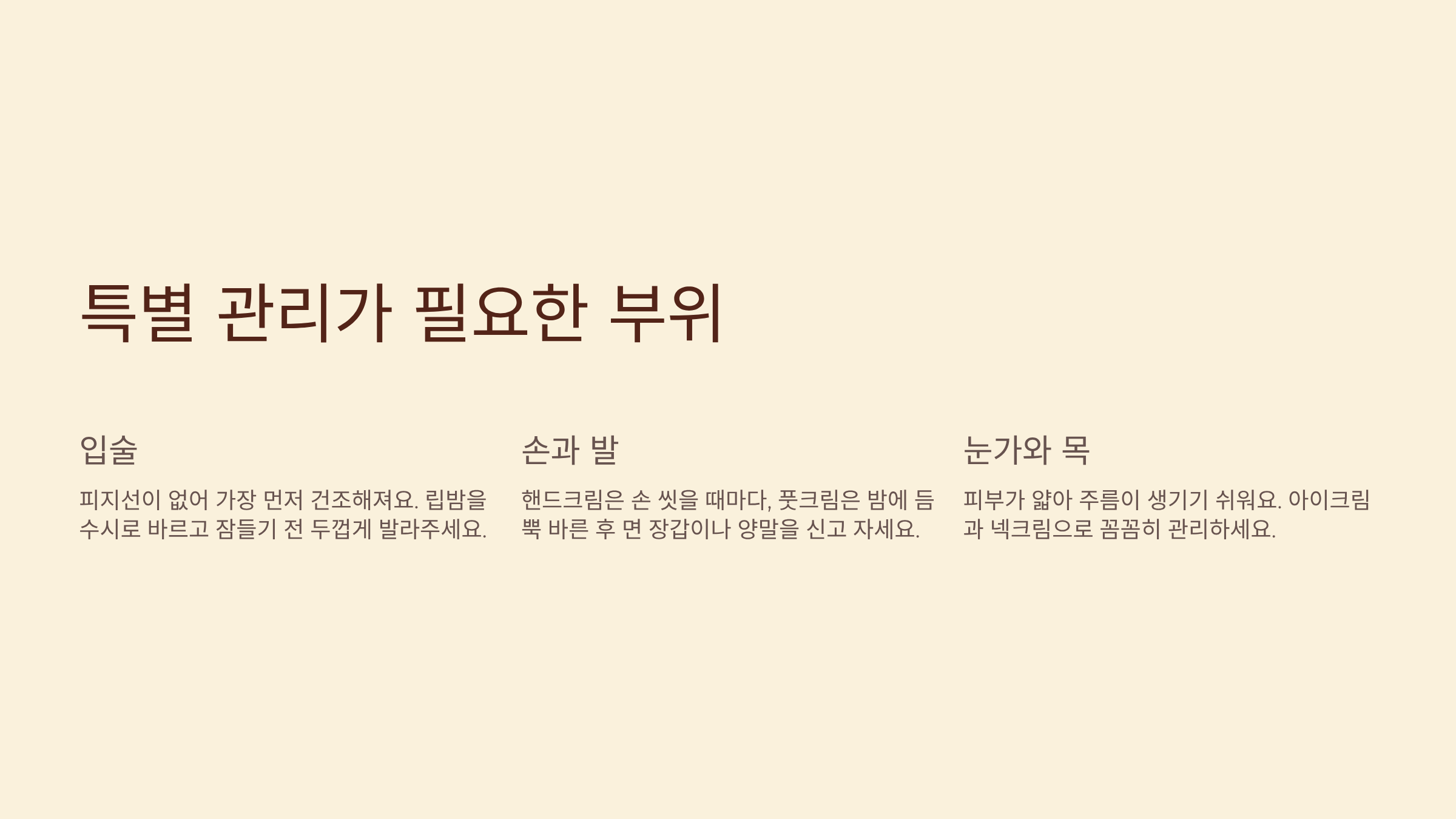 | 입술 | 립밤 수시로 | 각질 뜯지 않기 |