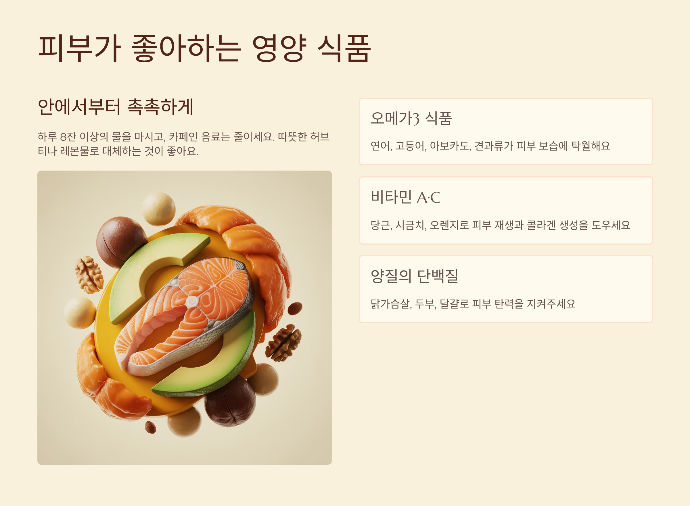 오메가3가 풍부한 연어, 고등어 같은 생선과 아보카도, 견과류를 충분히 섭취하면 피부 보습에 도움이 돼요. 비타민 A가 풍부한 당근, 시금치, 고구마도 피부 재생을 도와주죠. 제철 과일로 비타민 C를 보충하는 것도 잊지 마세요.