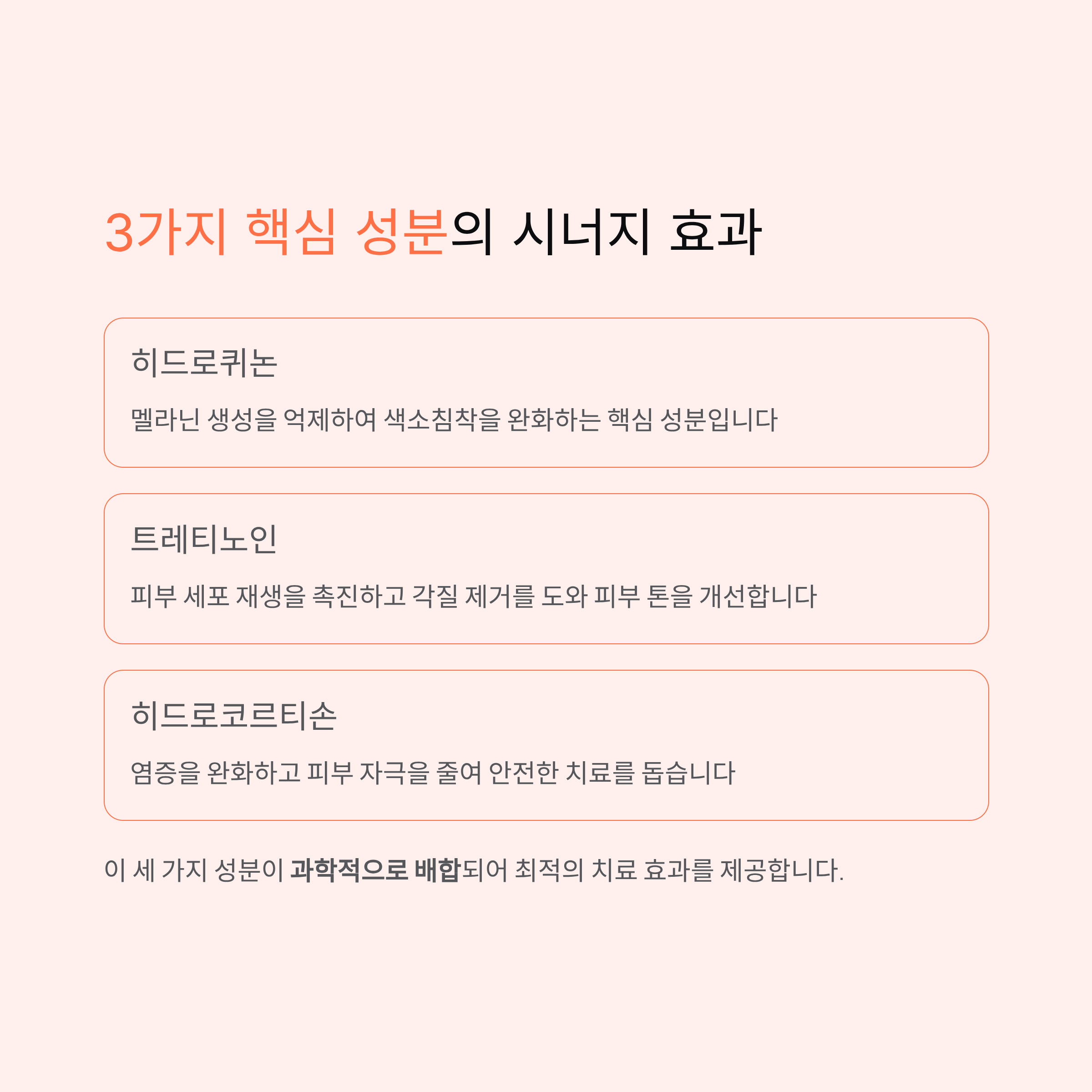 히드로퀴논은 멜라닌 생성을 억제하고, 트레티노인은 피부 재생 주기를 촉진해 색소의 배출을 도와요. 마지막으로 히드로코르티손은 염증을 완화하고 자극을 줄여주는 역할을 해요.