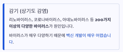 따라서 감기를 일으키는 바이러스는 매우 다양하기 때문에, 감기를 예방하는 백신 개발은 매우 어렵습니다. 반면 독감은 원인 바이러스가 정해져 있어서 매년 예방백신 접종이 가능합니다. 이것이 두 질병의 가장 근본적인 차이점입니다.
