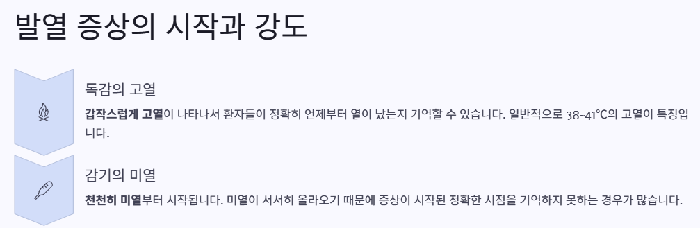 | 발열 | 갑작스러운 고열(38~41℃) | 천천히 올라오는 미열 |