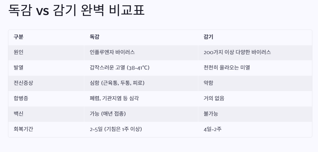 🚀 결론부터 말하면: 독감은 갑작스러운 고열과 심한 근육통으로 일상생활이 어려울 정도이며, 감기는 미열과 콧물이 천천히 나타나 일상생활에 큰 지장을 주지 않습니다.