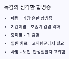 | 합병증 | 폐렴, 기관지염 등 심각 | 거의 없음 |