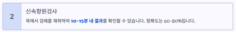 | 신속항원검사 | 목 검체 채취 | 10~15분 | 60~80% |