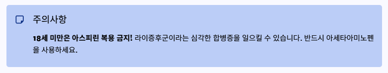 | 발열, 두통 | 아세타아미노펜 (타이레놀) | 18세 미만 아스피린 금지 |