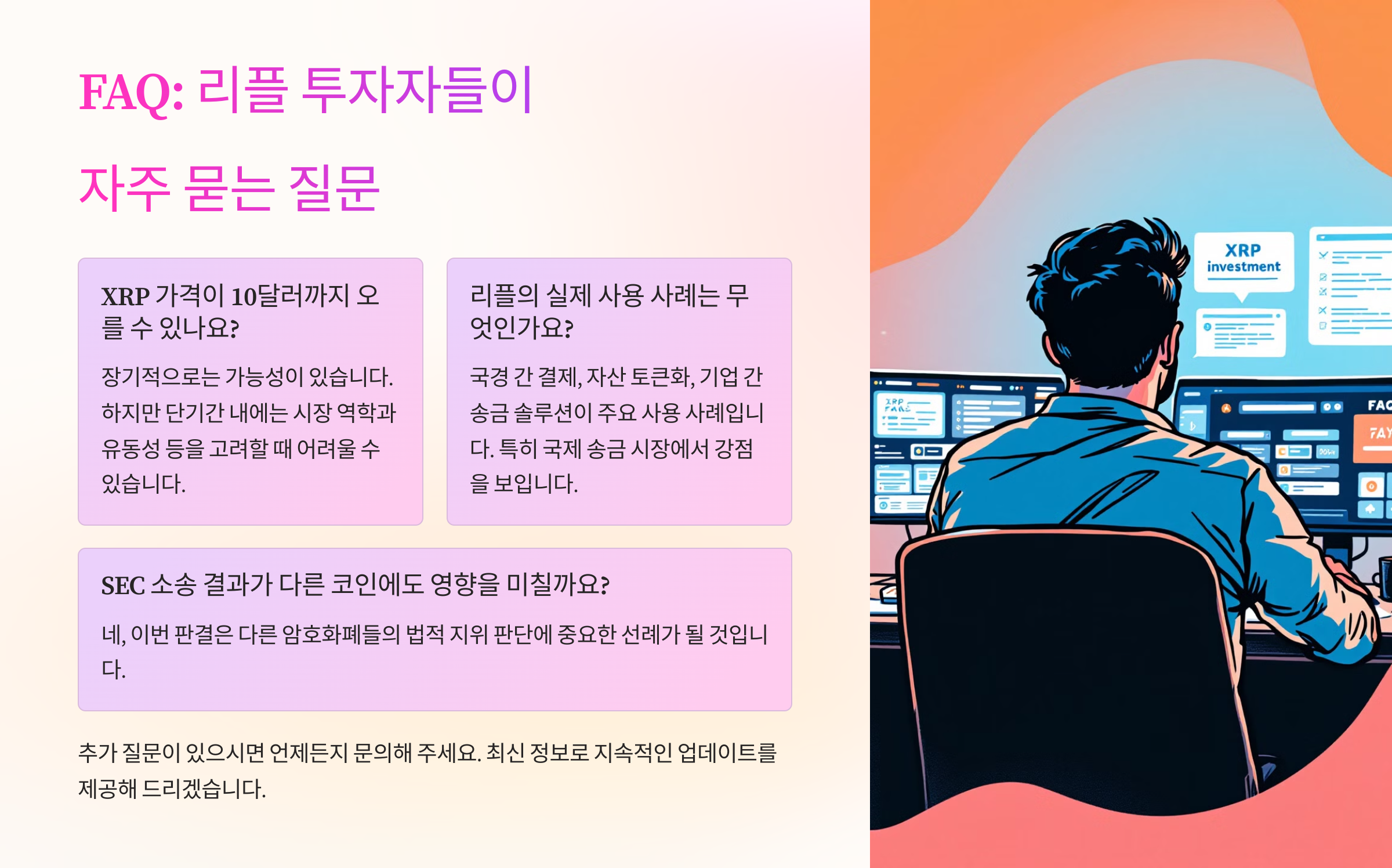 시장 참여자들에게는 새로운 투자 판단 기준이 생겼다고 볼 수 있어요. 과거에는 기술력, 트렌드, 커뮤니티 중심으로 코인을 평가했다면, 이제는 법적 안정성과 제도권 진입 가능성도 중요한 체크리스트가 된 거예요. 리플은 그 관문을 통과한 첫 사례로 자리 잡게 되었고, 이는 향후 ETF 승인, 기관 투자 확대, 글로벌 사용성 증가로 이어질 가능성이 높아요. 단기 수익보다 장기적인 시장 구조 변화에 주목해야 할 타이밍이에요.