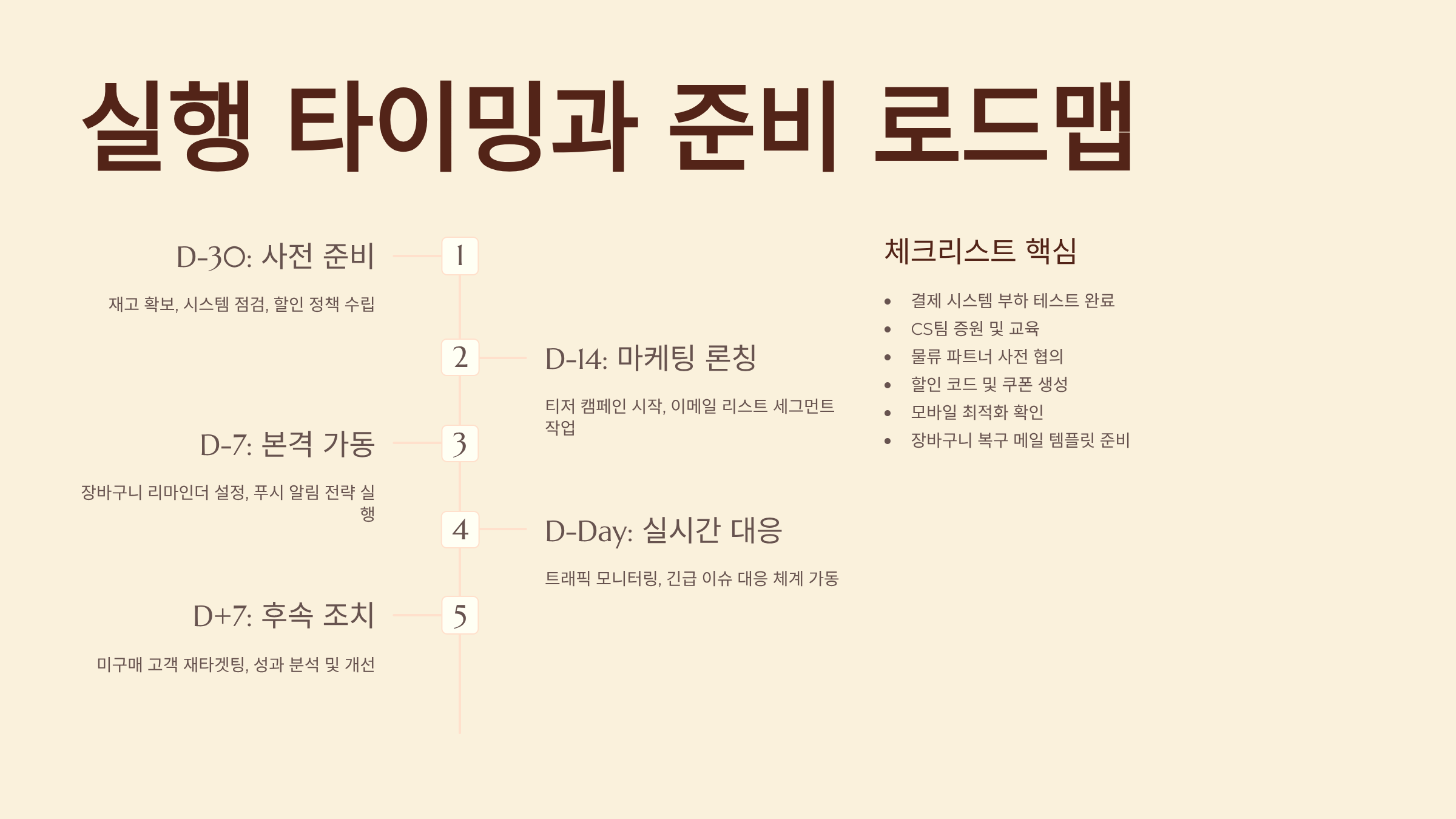 | D-1 자정 전 | 결제 수단/주소/쿠폰 점검 | 배송지 오류 방지 |