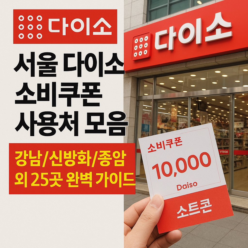 서울 전역에서 소비쿠폰으로 다이소 쇼핑을 똑똑하게 하고 싶다면? 🎟️ 지금 소개하는 리스트만 참고하면 헛걸음 없이 쿠폰 알차게 쓸 수 있어요. 특히 강남, 신방화, 종암 같은 인기 지역을 포함해 총 25곳 이상의 매장을 정리했답니다!