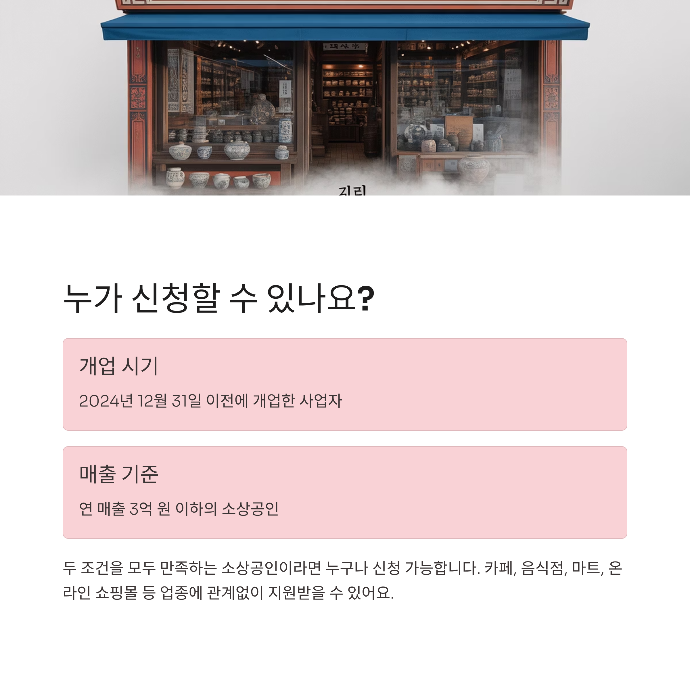 지원 대상은 2024년 12월 31일 이전 개업한 소상공인이에요. 개인·법인 모두 신청 가능하며, 신청일 기준 폐업 상태가 아니어야 해요. 즉, 현재 영업 중이어야 한다는 조건이에요.