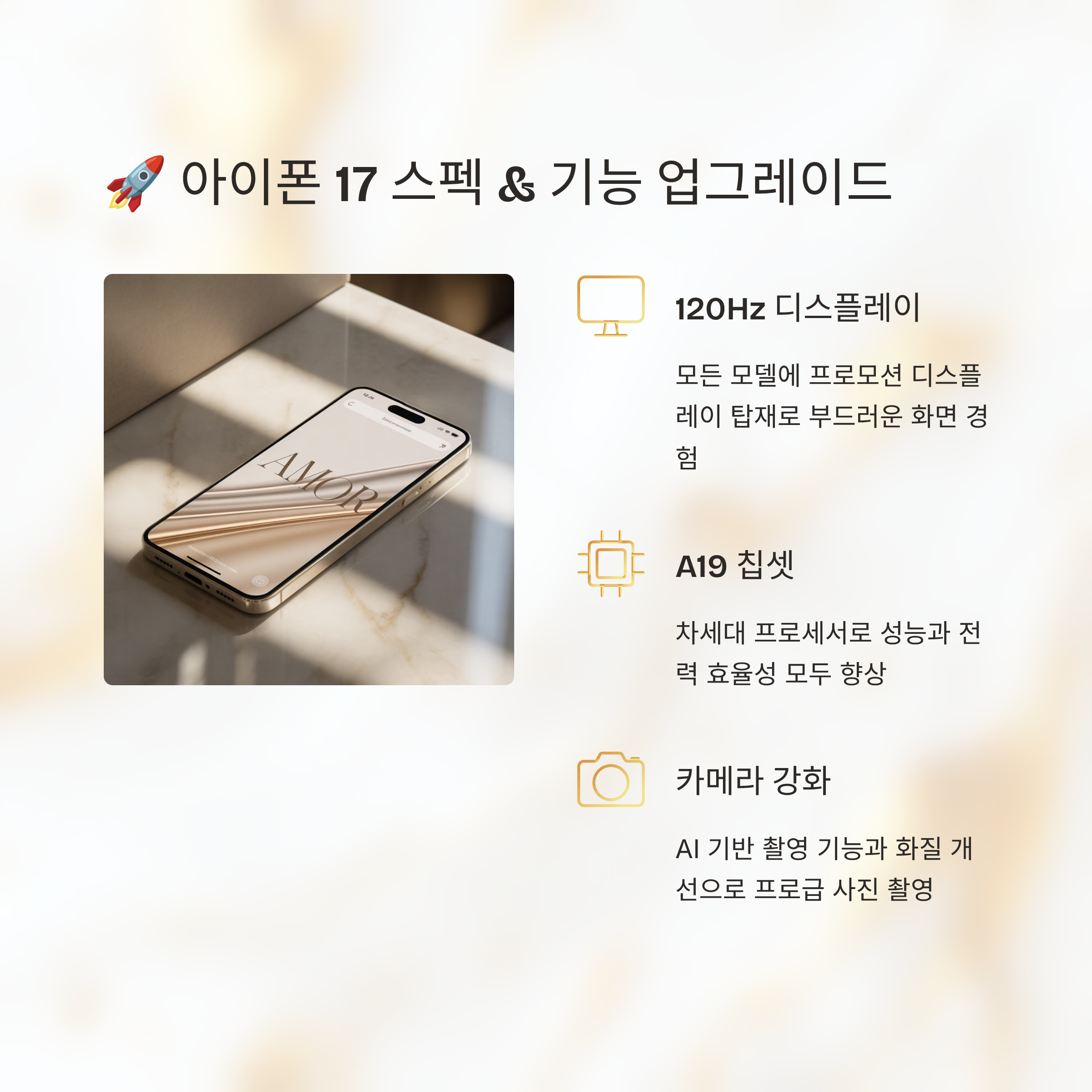아이폰17에서는 '보는 즐거움'도 함께 업그레이드돼요. 전 모델에 120Hz ProMotion 디스플레이가 기본 적용될 것으로 보이며, 에어 모델도 예외는 아니에요. 🎥