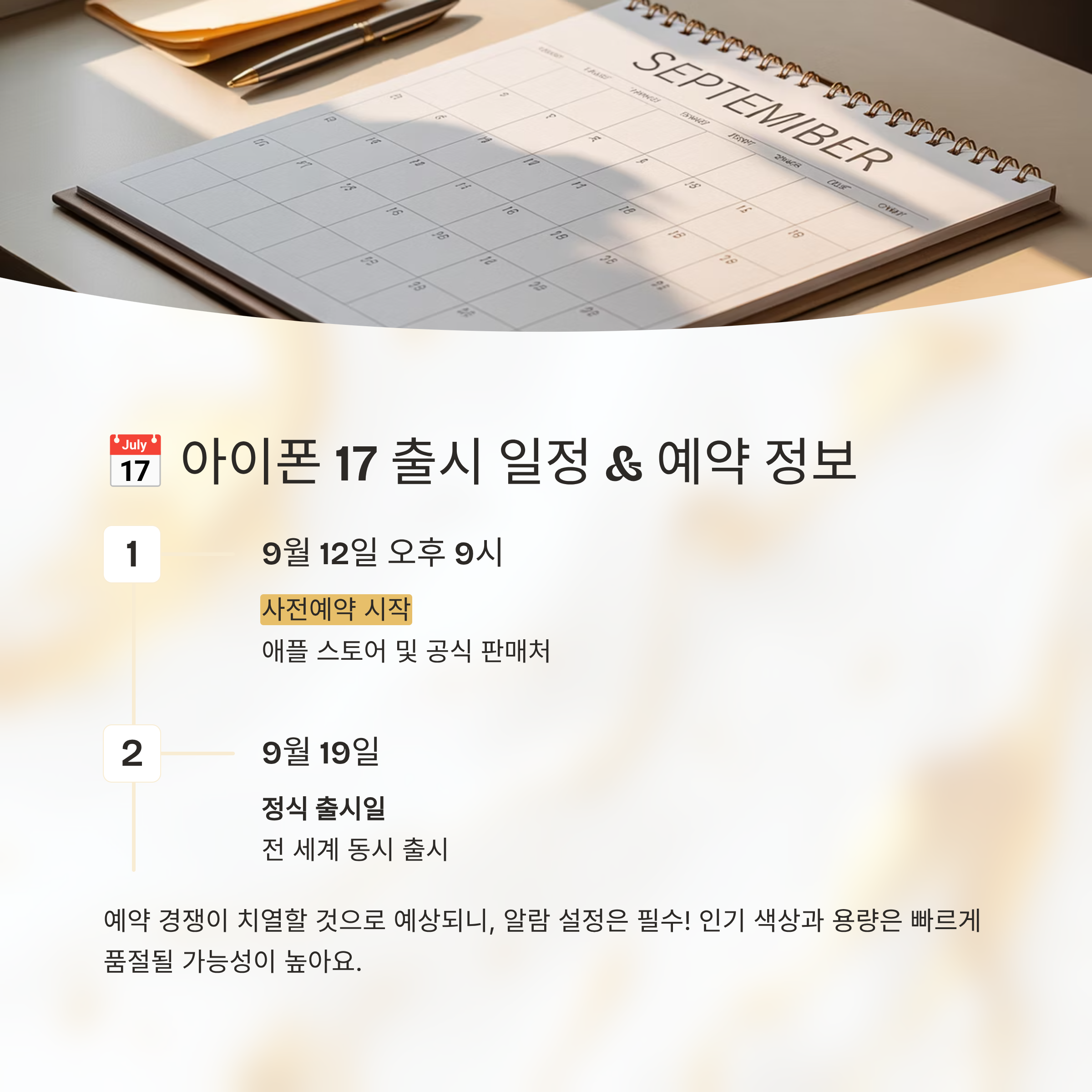 아이폰17의 사전예약은 2025년 9월 12일(금) 오후 9시에 시작돼요. 애플스토어, 통신사, 오픈마켓 등 여러 채널에서 동시 시작되기 때문에 '속도전'이 중요해요! ⏱️