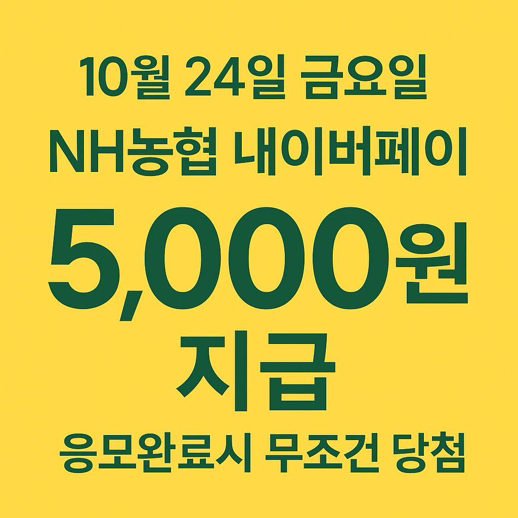단 하루, 단 한 번의 찬스! 오늘(10월 24일) NH농협은행에서 깜짝 선물을 준비했어요🎁 네이버페이 포인트 5,000원은 물론, 치킨까지 노려볼 수 있는 특별 이벤트예요. 하지만 중요한 포인트! 이 이벤트는 **NH농협은행이 사전에 선정한 고객님들만** 참여 가능하다는 점 꼭 기억해 주세요.