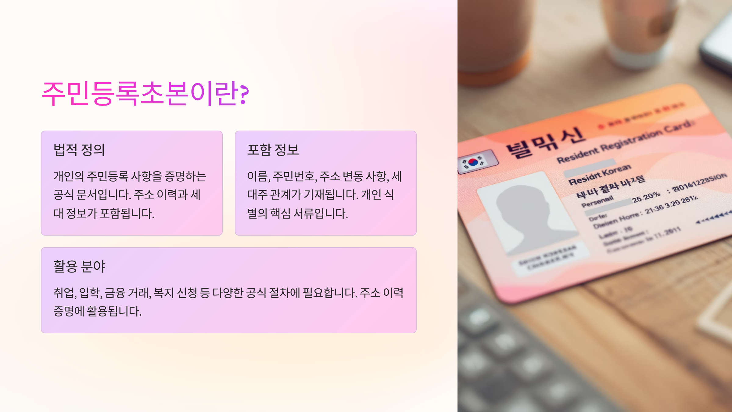 주민등록초본은 주민의 주소 변동 사항, 병역 이력(해당자만), 세대 구성 변동 등 기본적인 신상 이력이 요약된 공식 문서예요. 말 그대로 '요약본'이라 등본보다 내용은 간단하지만, 이력 정보가 포함돼 있어요. 🧾