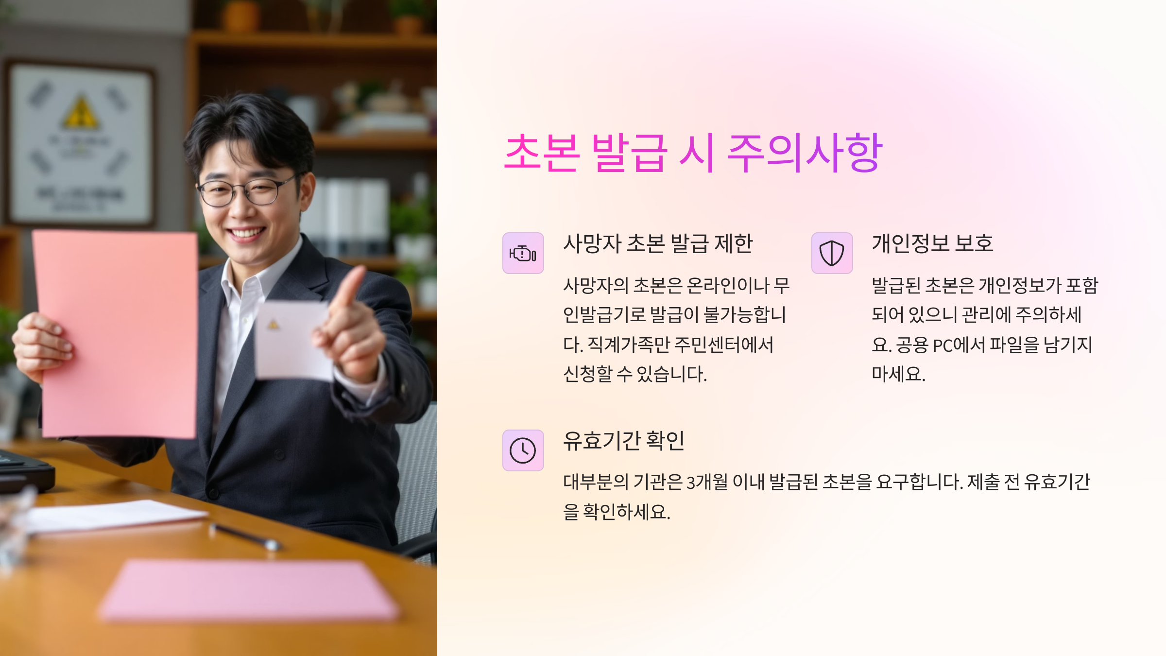 초본은 개인정보가 많기 때문에 파일 저장 후 비밀번호 설정을 추천드려요. 특히 온라인 제출 시 보안을 위해 압축 후 전송하는 게 좋아요. 🔐