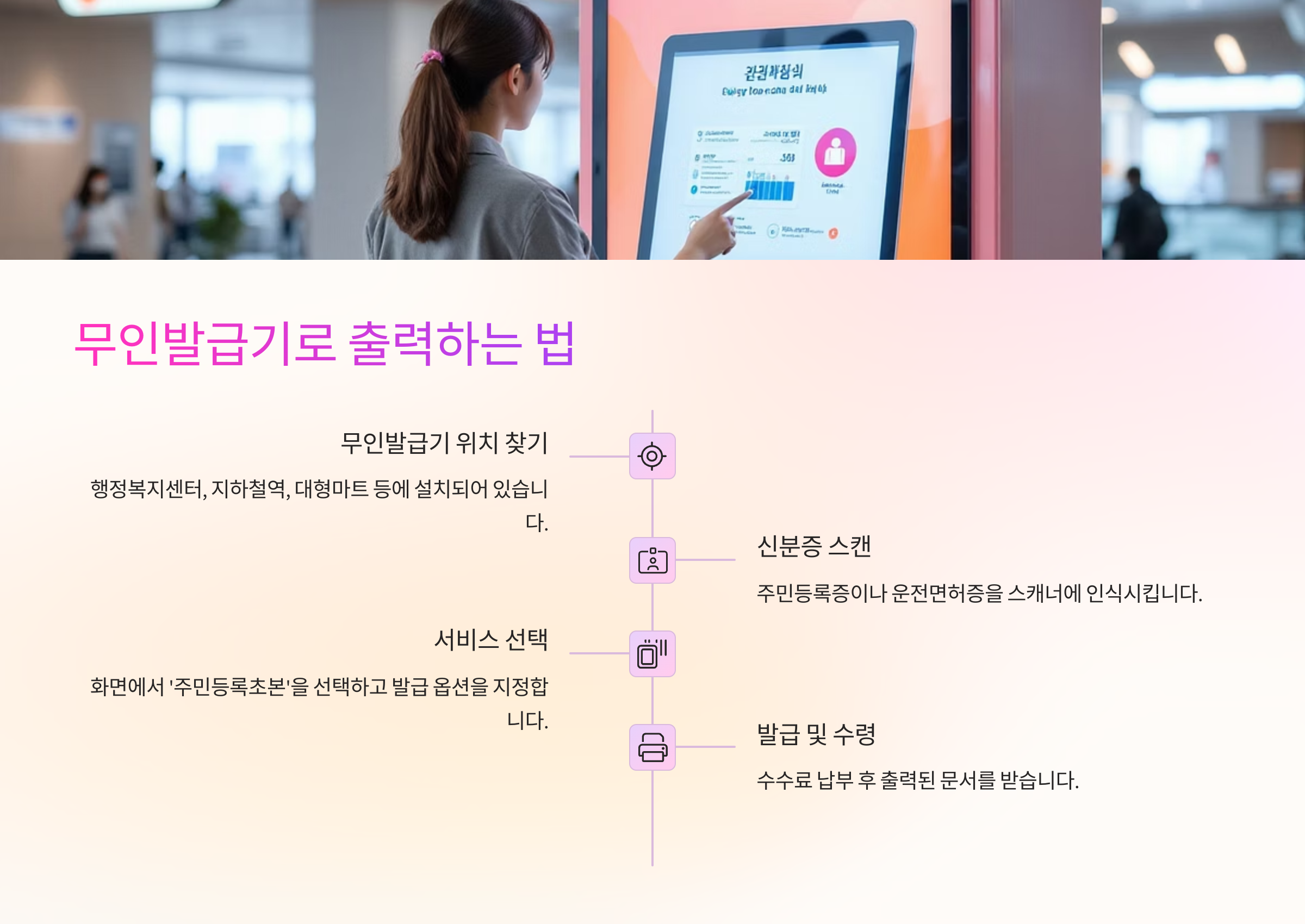 ✅ 무인기 발급 순서 1) '주민등록초본' 선택 2) 주민등록번호 입력 또는 지문인식 3) 발급 항목 선택 (병역 포함 여부, 주소이력 등) 4) 출력 진행 (흑백 인쇄 / 대부분 무료)