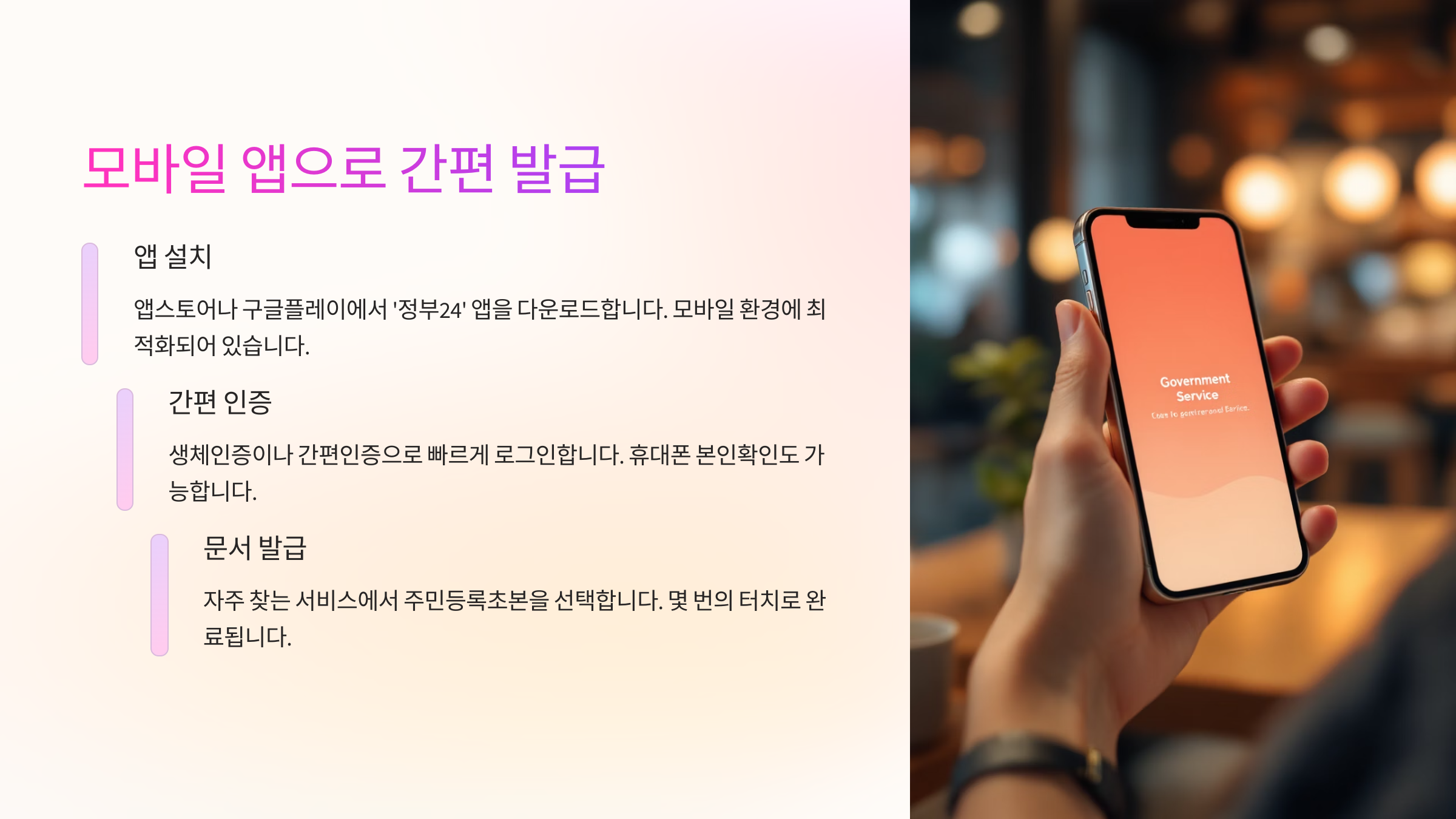 이제 초본도 스마트폰으로 발급받을 수 있어요! 정부24 앱이나 모바일 전자지갑 앱을 통해 모바일 인증 후 PDF로 저장할 수 있고, 파일을 이메일로 보내거나 바로 제출도 가능해요. 📲