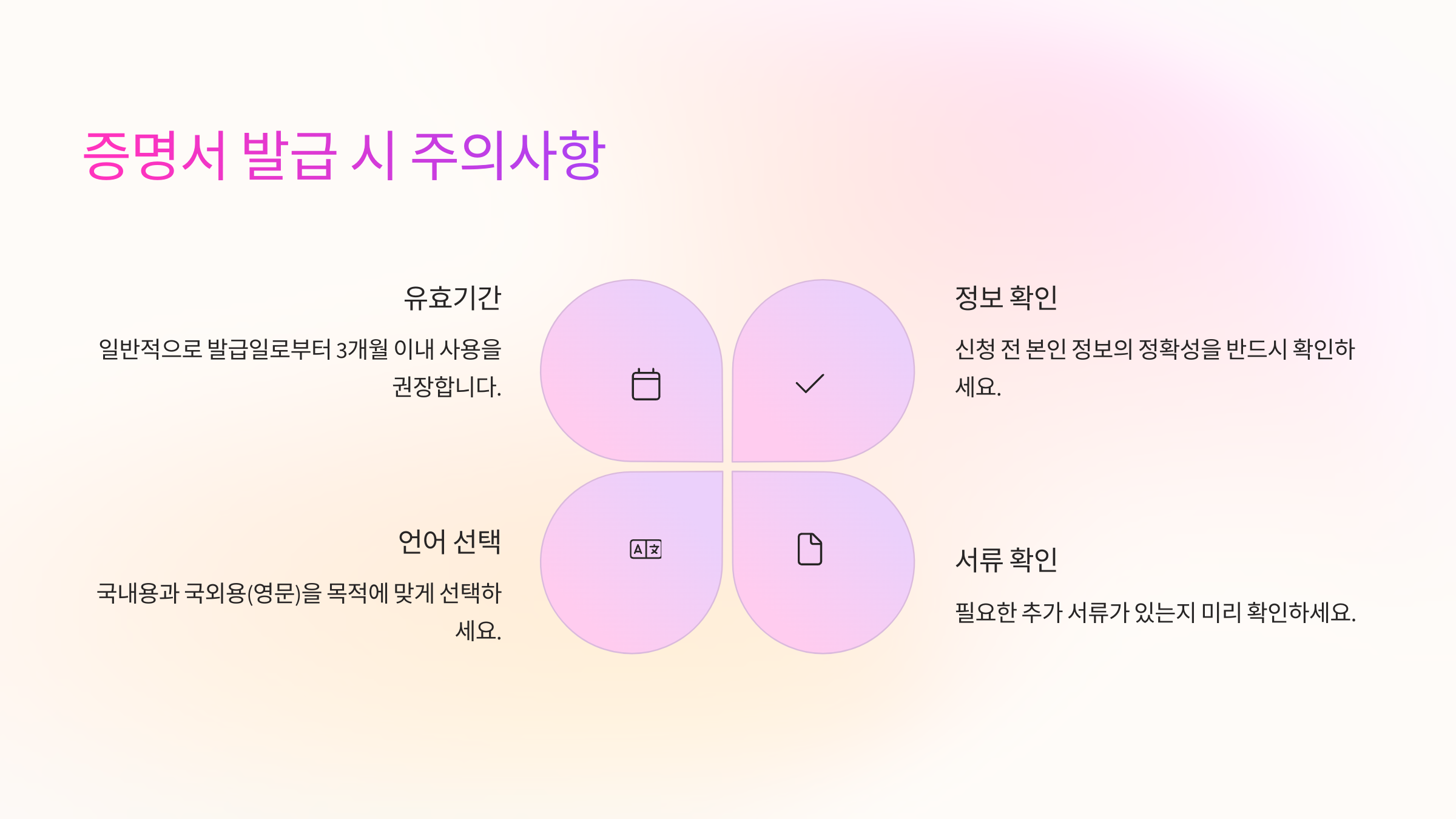 ✔ 발급 신청 전 대상자 확인: 본인 외 가족 또는 대리 신청 시 위임장 필요 ✔ 최근 출입국 이력 반영 여부: 출입국 직후에는 반영까지 1~2일 소요될 수 있음 ✔ 제출처에 맞는 언어: 국문/영문 선택 가능 (영문 필요 시 체크!) ✔ 유효기간: 일반적으로 3개월 이내 서류 제출을 권장