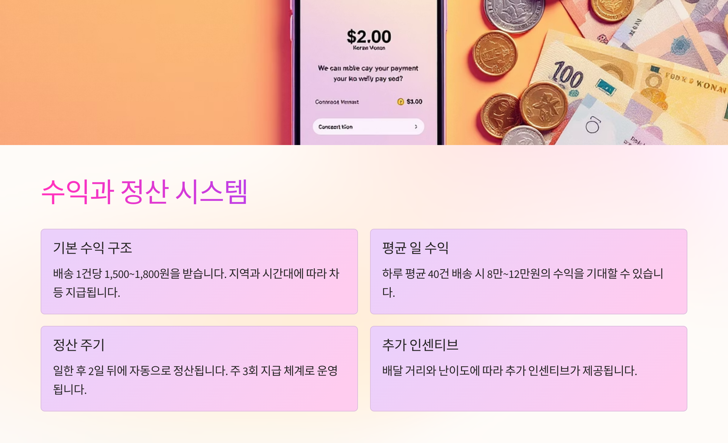 | 새벽 배송 (03~07시) | 4~7만 원 | 짧은 시간 고수익 가능 |