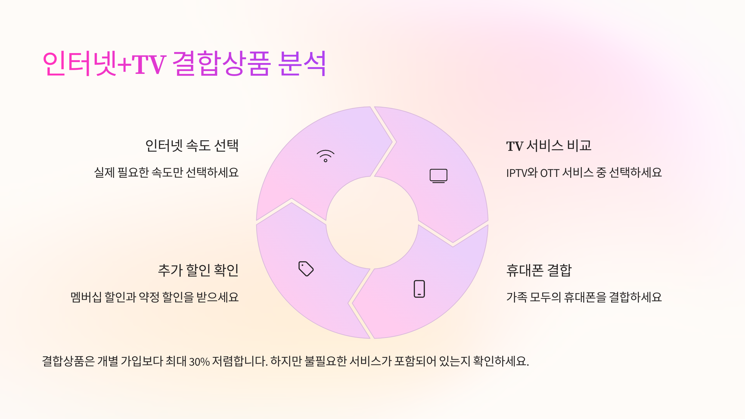 휴대폰 요금만 줄이는 게 끝이 아니에요. 요즘은 집에 인터넷과 IPTV도 거의 필수죠. 그런데 따로 신청하면 비싸고, 결합상품으로 가입하면 훨씬 저렴하답니다! 📉