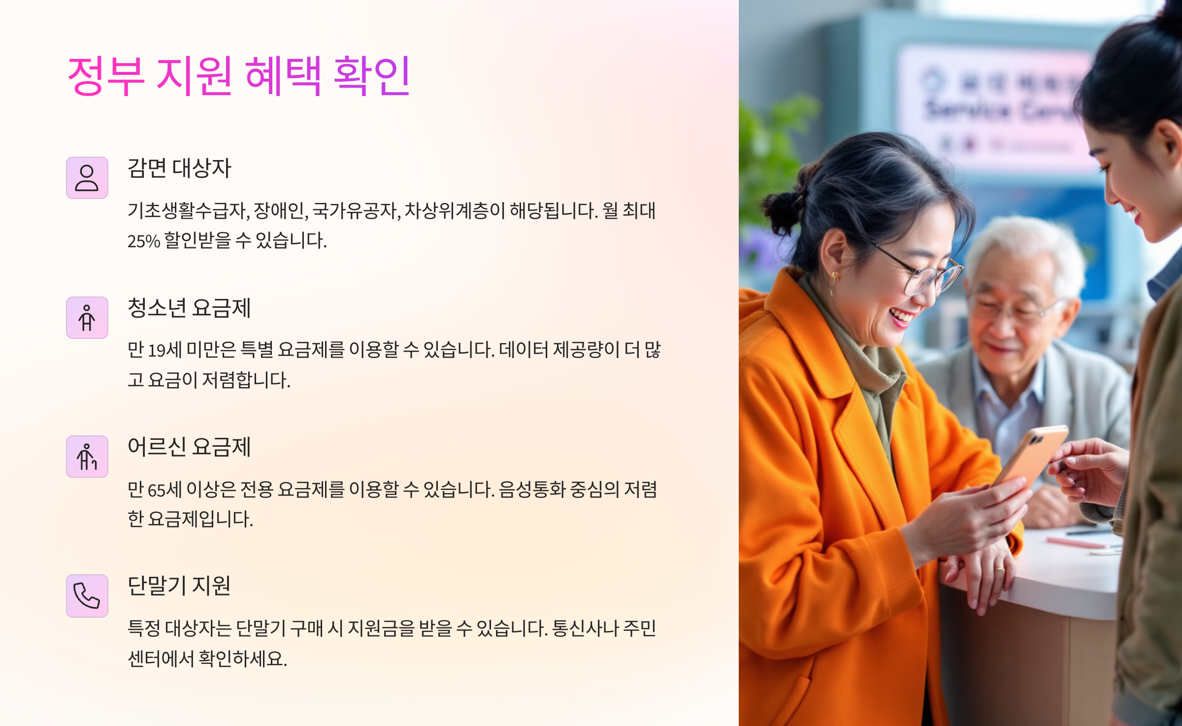 기초생활수급자 / 차상위계층: 월 최대 1만1000원 감면 ✔ 만 65세 이상 고령층: 기본료 일부 감면 가능 ✔ 만 29세 이하 청년: 청년 요금제 가입 가능, 알뜰폰 요금제도 혜택 ✔ 장애인 / 국가유공자: 통신사 고객센터에서 별도 감면 신청 가능