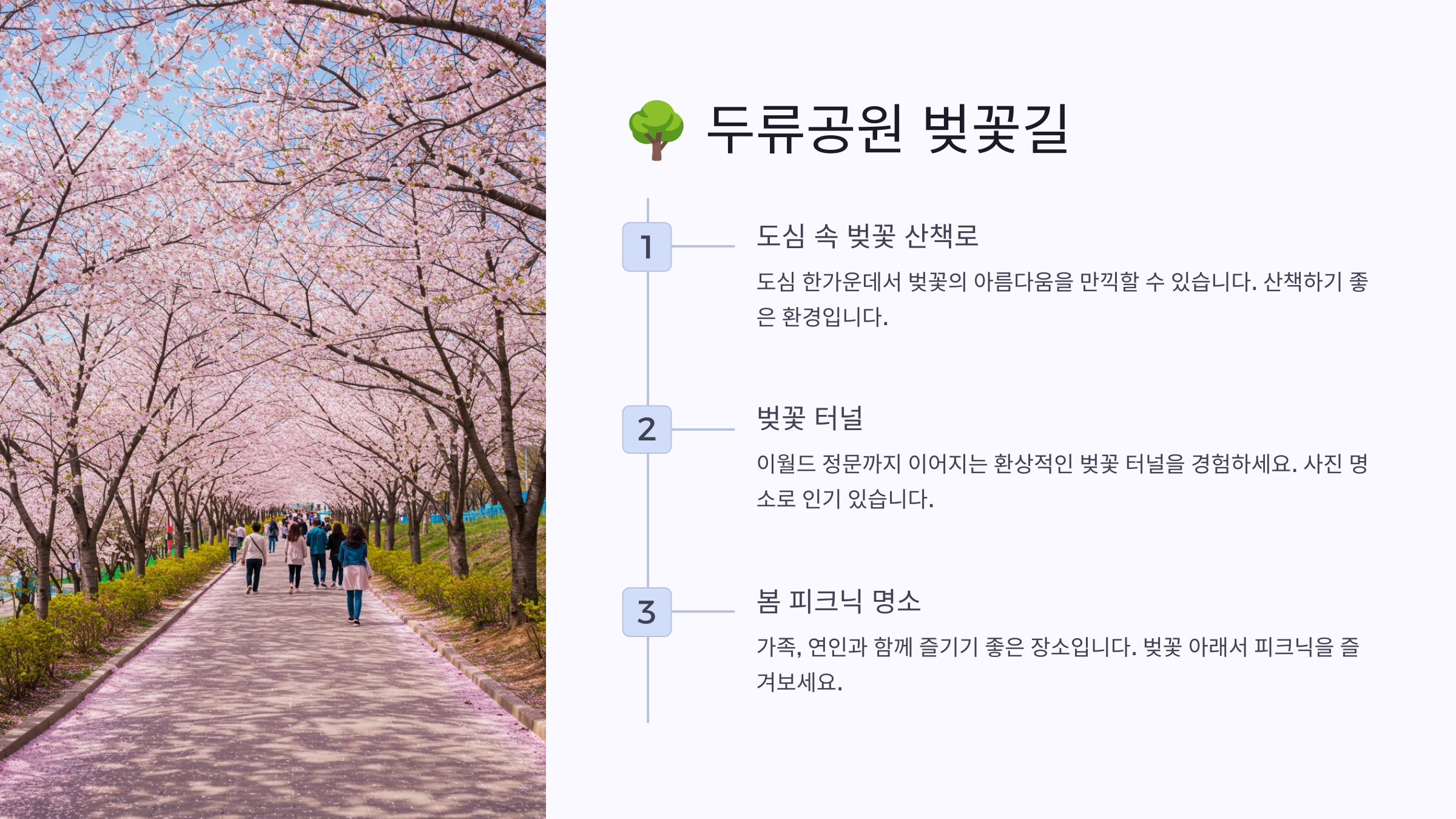 | 두류공원 | 넓은 공원에 벚꽃길이 조성됨 | 자연 속에서 여유롭게 산책 가능 |