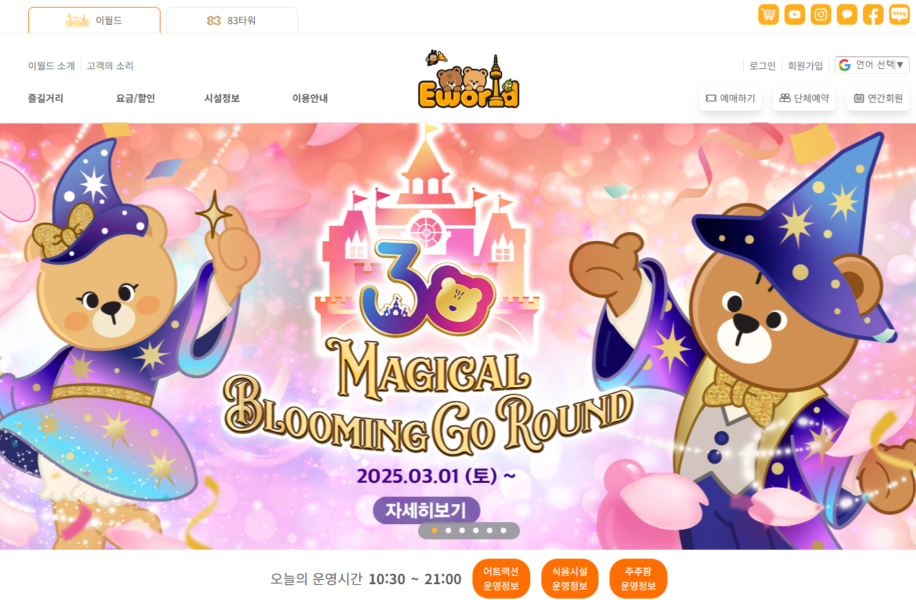 이월드는 대구에서 가장 많은 벚꽃이 심어져 있는 명소 중 하나로, 10만 그루 이상의 벚꽃나무가 공원 곳곳을 화려하게 수놓아요. 낮에는 푸른 하늘과 함께 벚꽃을 감상하고, 밤에는 조명 아래 빛나는 벚꽃길을 걸으며 색다른 분위기를 즐길 수 있어요.