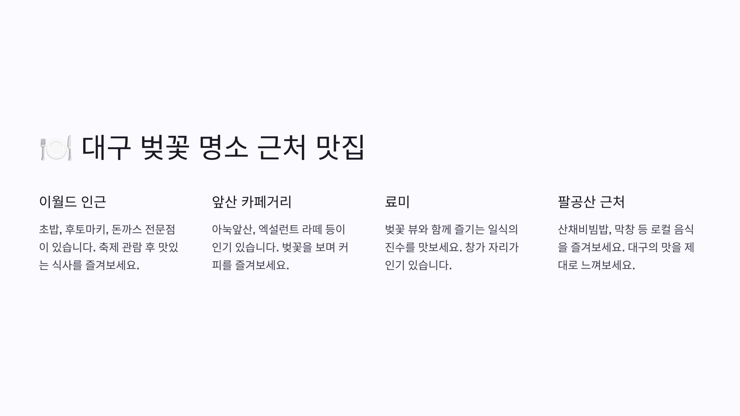 A5. 대구 따로국밥(두류공원 근처), 앞산 명물 찜갈비(앞산 공원 근처), 수목원 막창(이월드 근처), 벚꽃카페(두류공원 & 앞산) 등이 있어요. 벚꽃 구경 후 대구에서만 맛볼 수 있는 특별한 음식을 즐겨보세요.