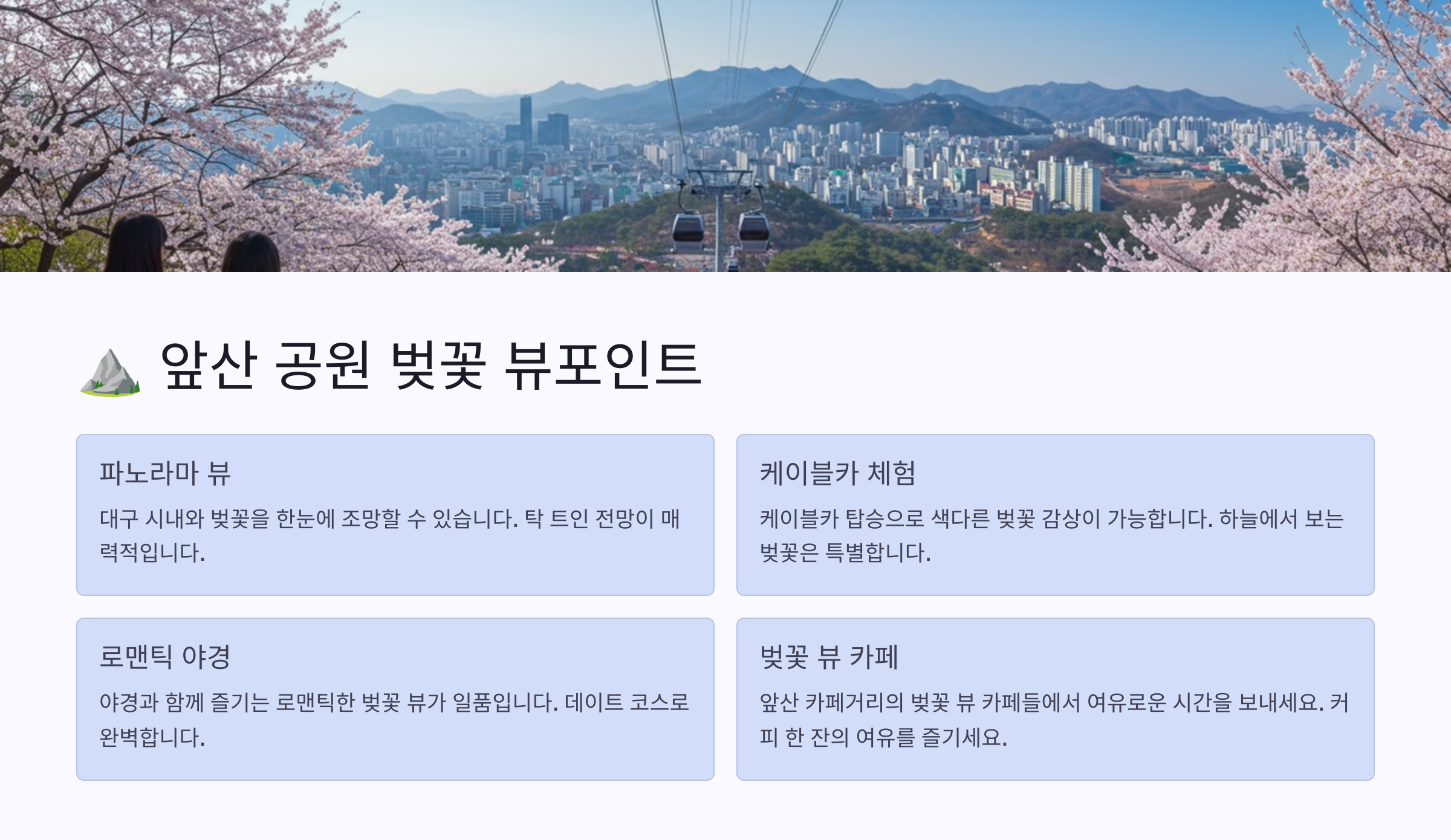 앞산 공원은 낮에는 벚꽃과 함께 대구의 전경을 감상하고, 저녁에는 반짝이는 야경과 함께 낭만적인 시간을 보낼 수 있는 최고의 벚꽃 명소예요. 벚꽃과 함께 특별한 시간을 보내고 싶다면 꼭 방문해 보세요.