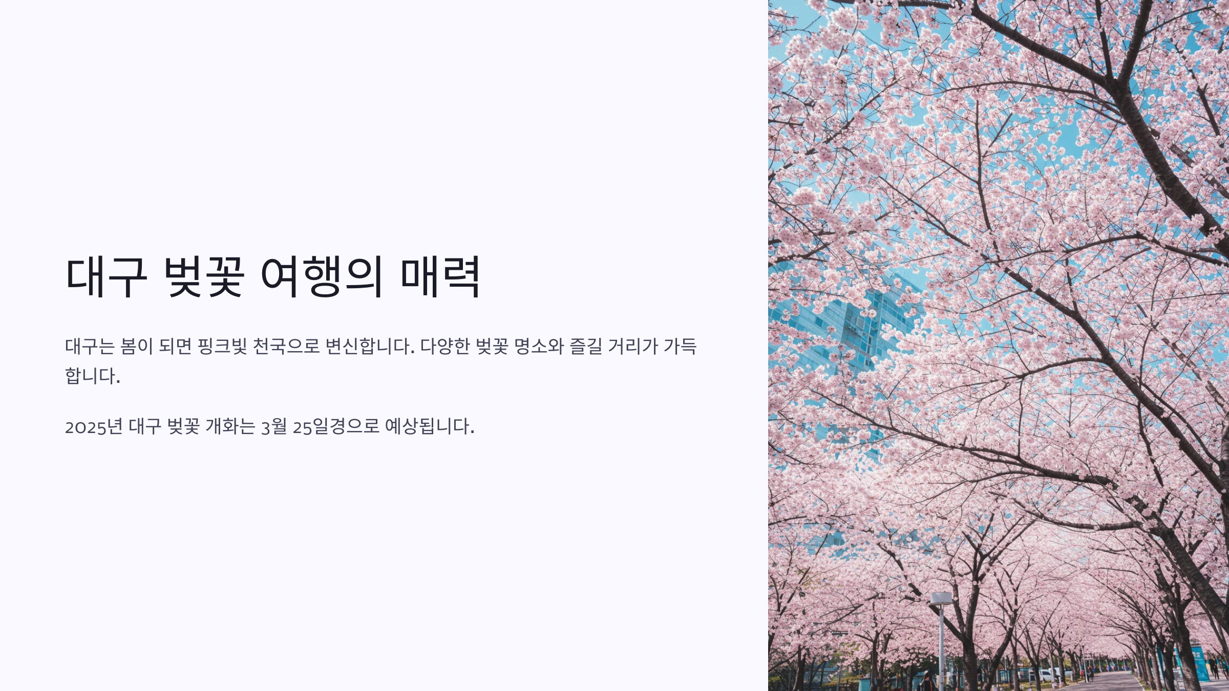 벚꽃이 만개하는 3월 말~4월 초에 대구를 방문하면 아름다운 봄 풍경을 만끽할 수 있어요. 이번 가이드에서는 대구에서 벚꽃을 제대로 즐길 수 있는 명소와 여행 코스를 소개할게요.