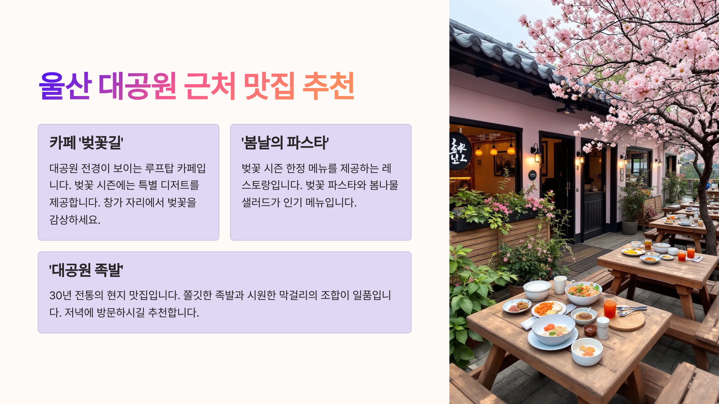 특히 울산 대공원 근처에는 현지인들에게 사랑받는 맛집이 많아요. 해산물 요리부터 고기 요리, 그리고 벚꽃을 보며 여유롭게 즐길 수 있는 카페까지, 취향에 따라 선택할 수 있어요.