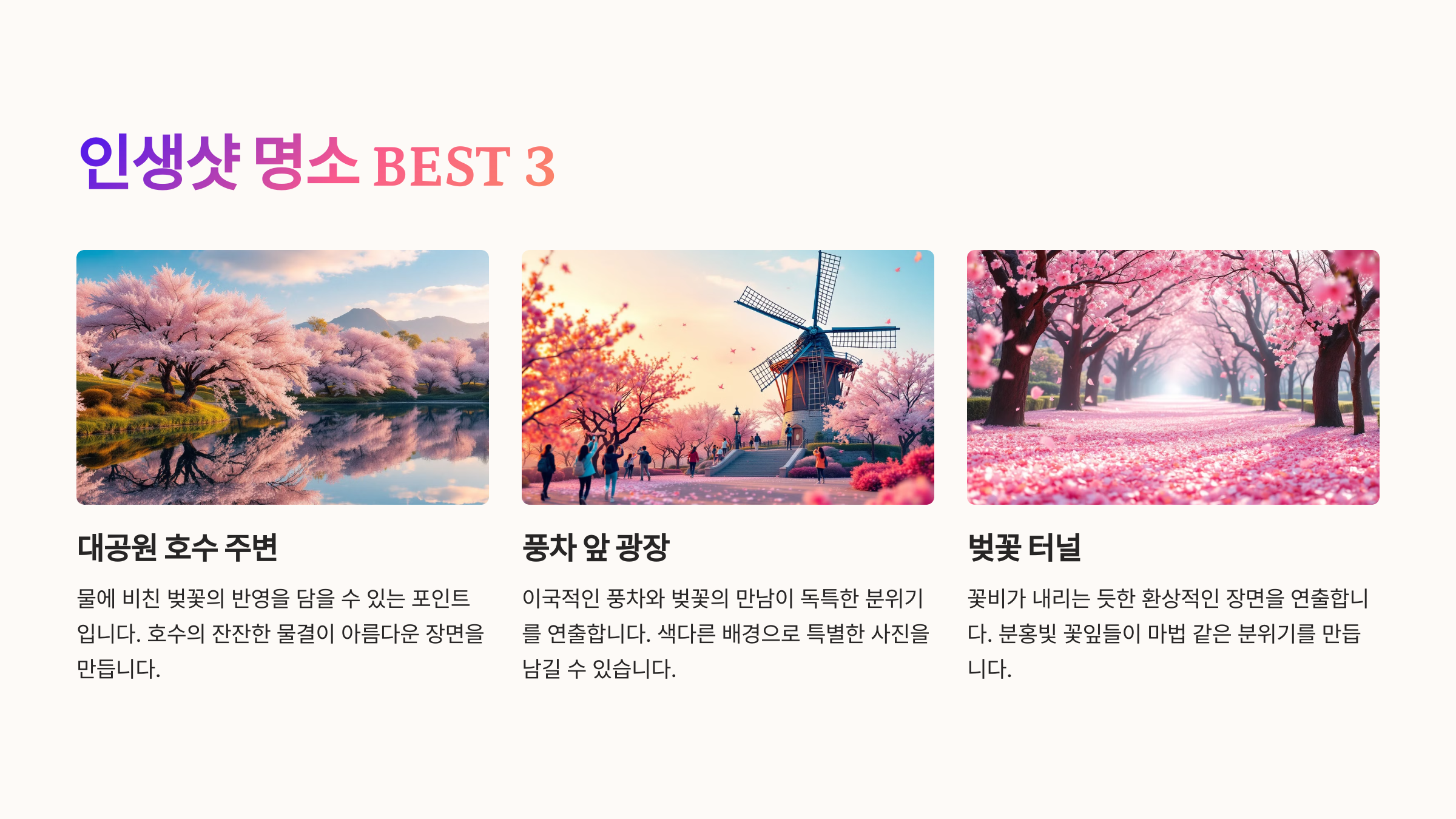 | 호수공원 벚꽃길 | 호수를 따라 펼쳐진 벚꽃과 반영된 풍경 | 로맨틱한 분위기와 감성 사진 촬영 명소 |