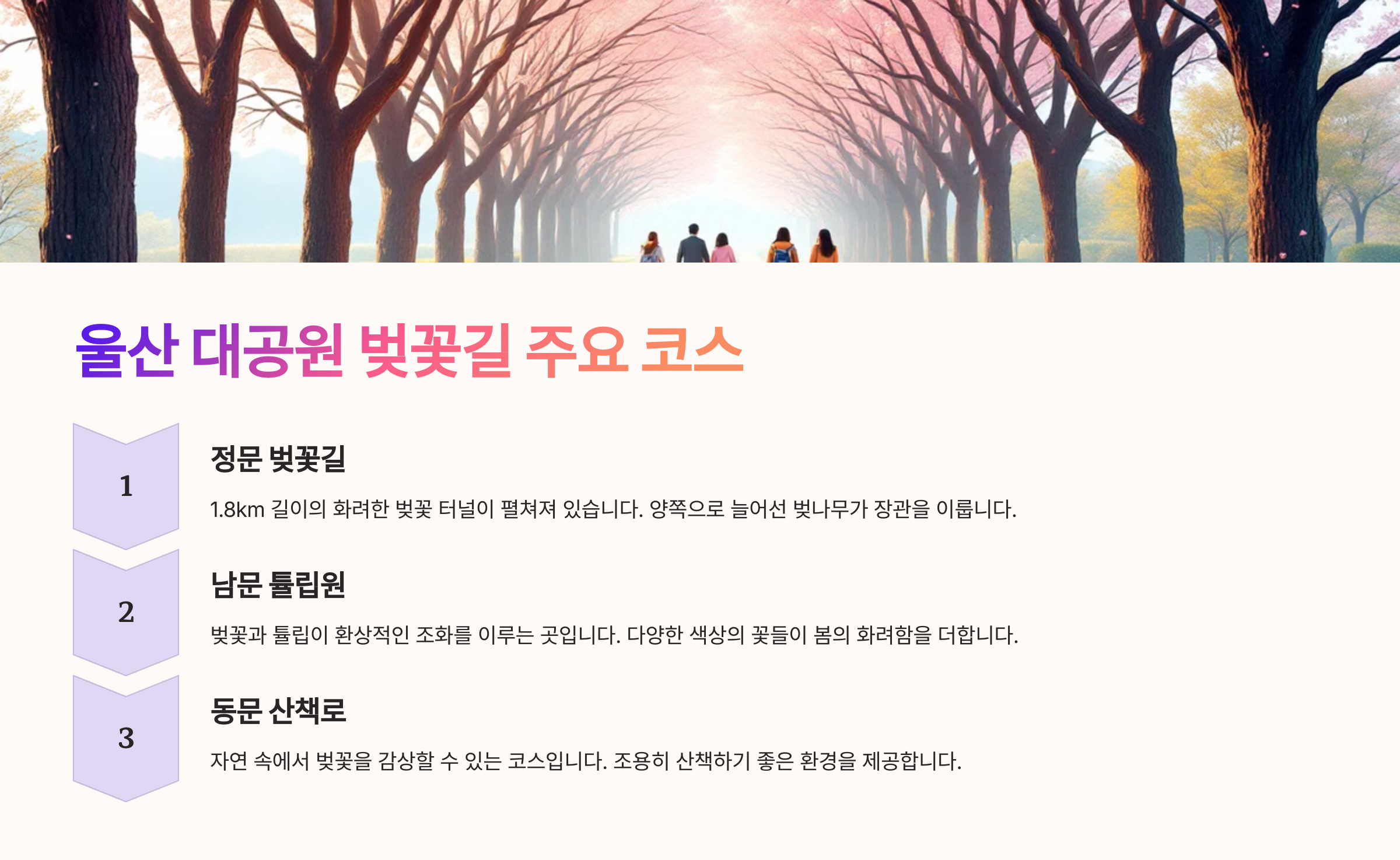 울산 대공원 벚꽃길은 단순한 산책로가 아니라, 벚꽃과 자연이 어우러진 특별한 공간이에요. 가족, 친구, 연인 누구와 함께 가도 좋은 곳이니 이번 봄에 꼭 방문해 보세요.