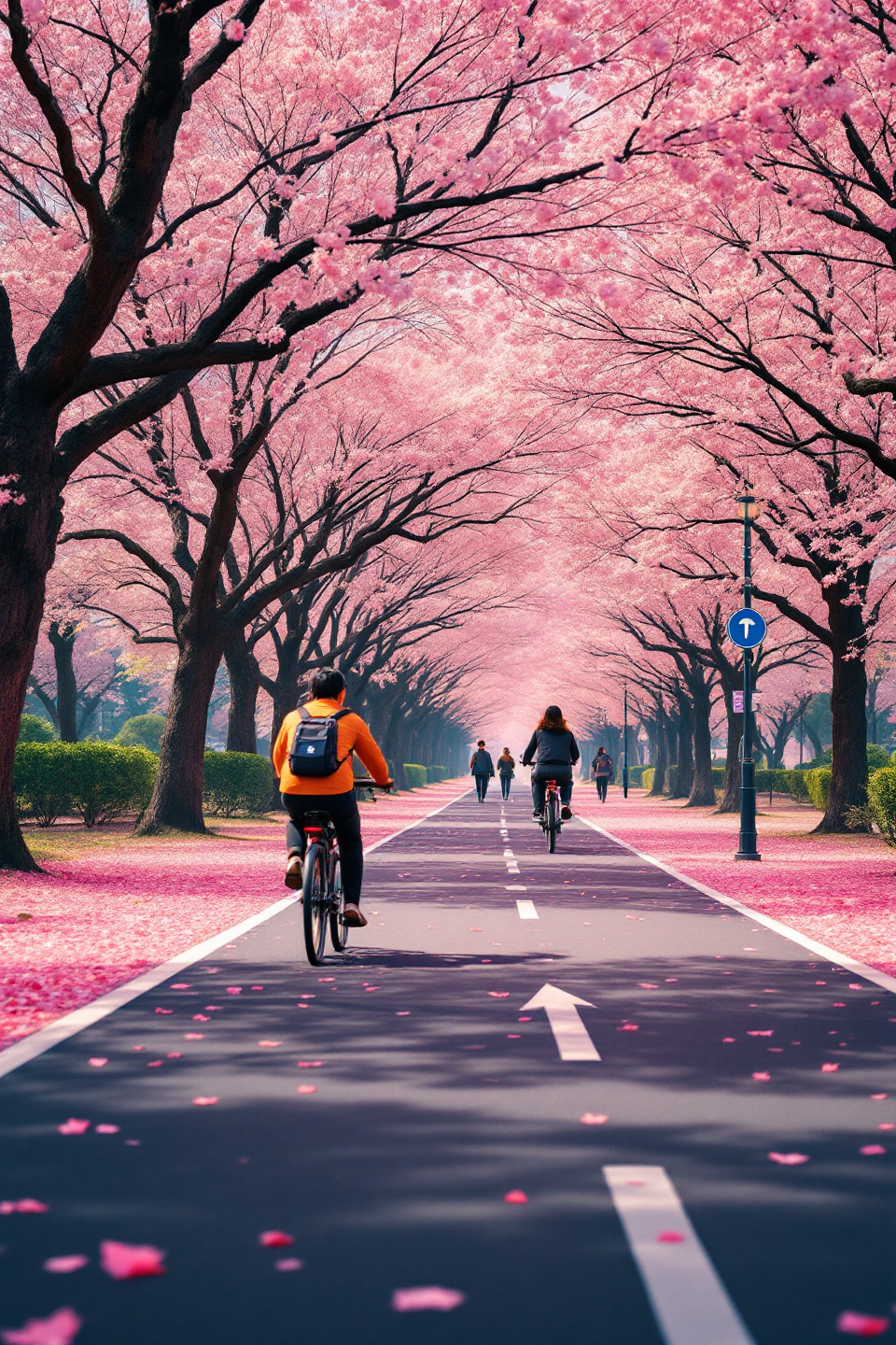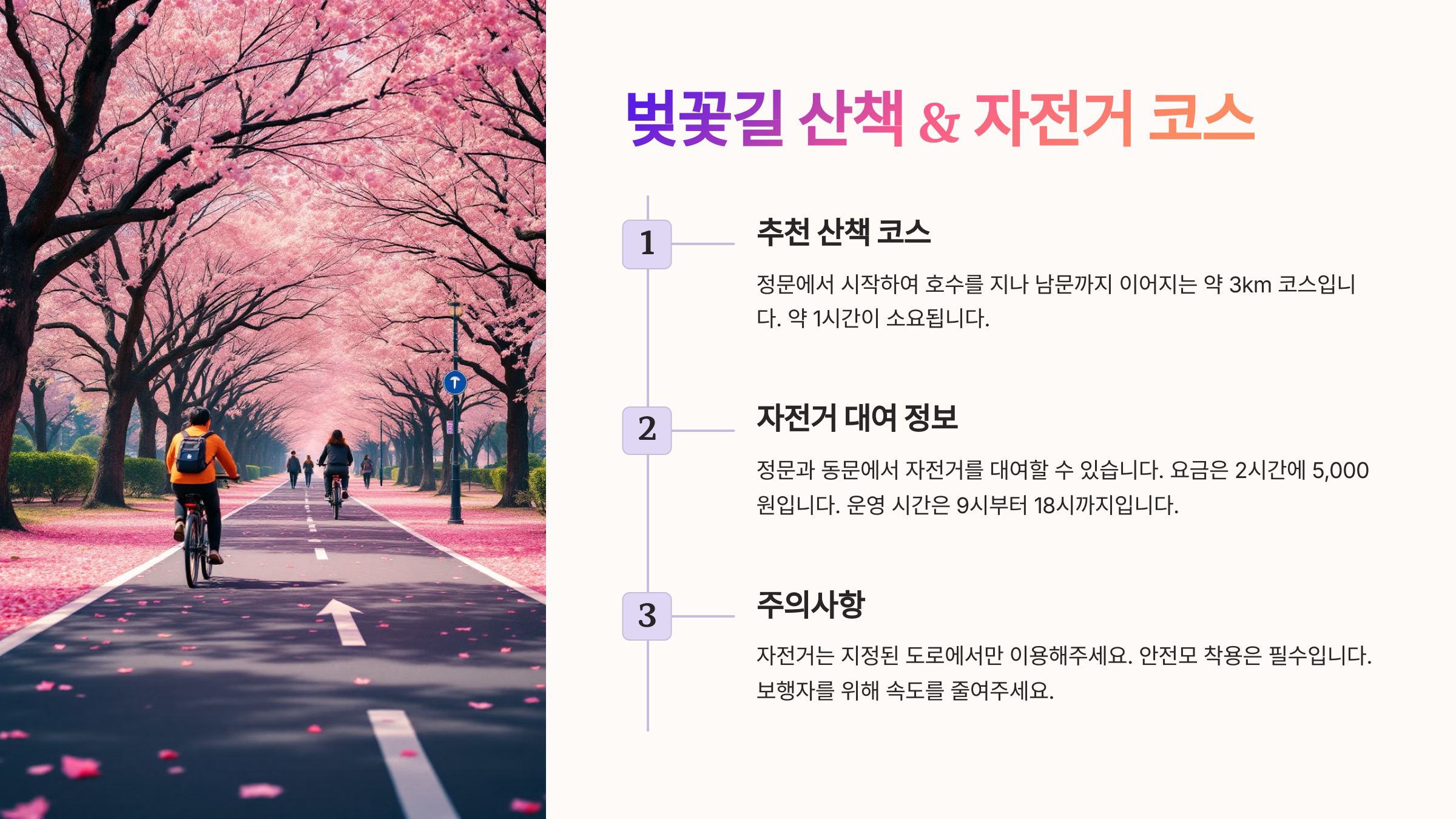 | 자전거 도로 | 벚꽃 아래를 달릴 수 있는 라이딩 코스 | 자전거를 타면서 벚꽃을 감상할 수 있음 |