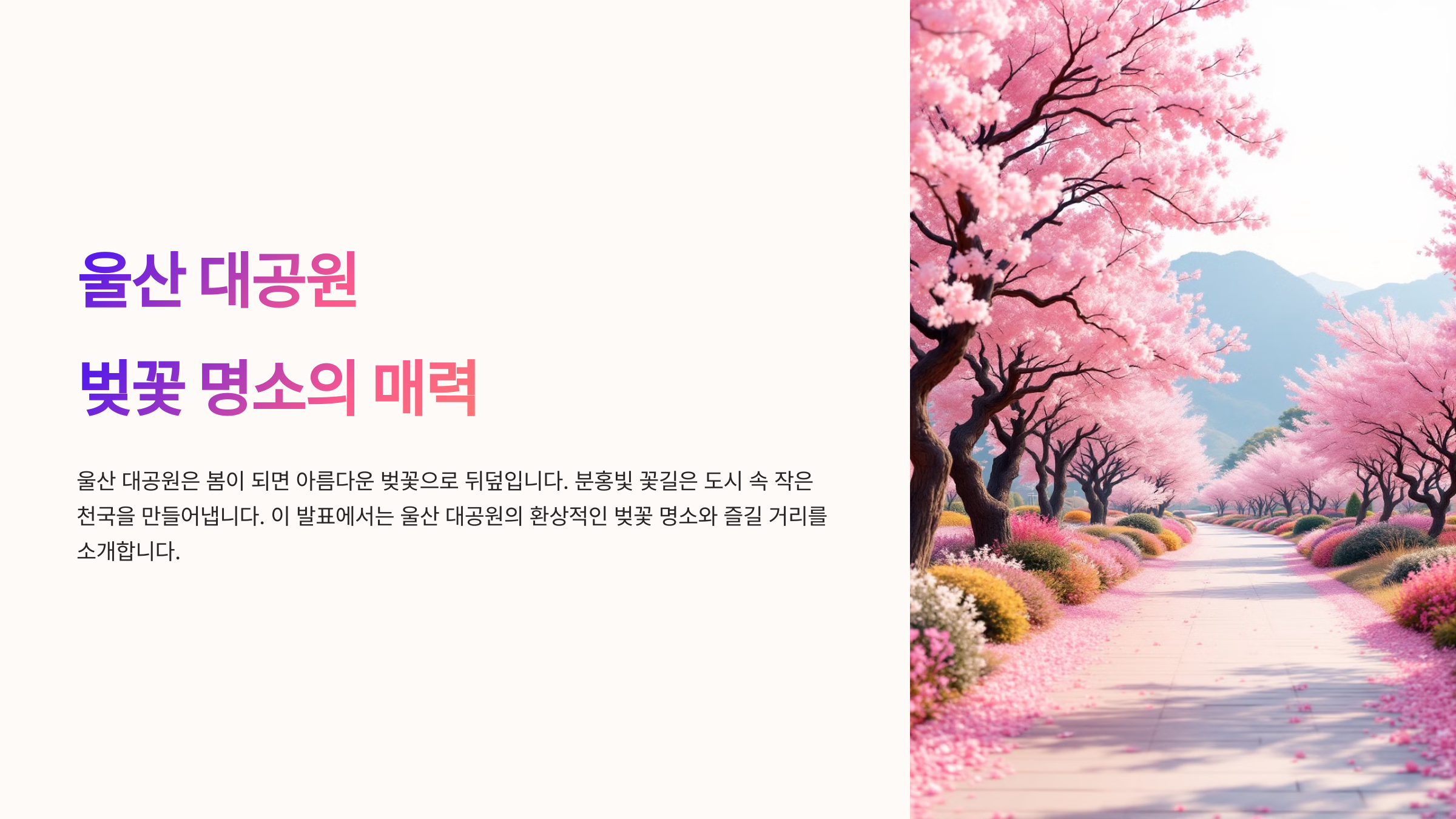 울산 대공원은 울산을 대표하는 도심 속 자연공원으로, 벚꽃 시즌이 되면 공원 전체가 분홍빛으로 물들며 환상적인 풍경을 연출해요. 공원 내에는 수천 그루의 벚꽃나무가 심어져 있어서 어디에서든 아름다운 벚꽃을 감상할 수 있어요.