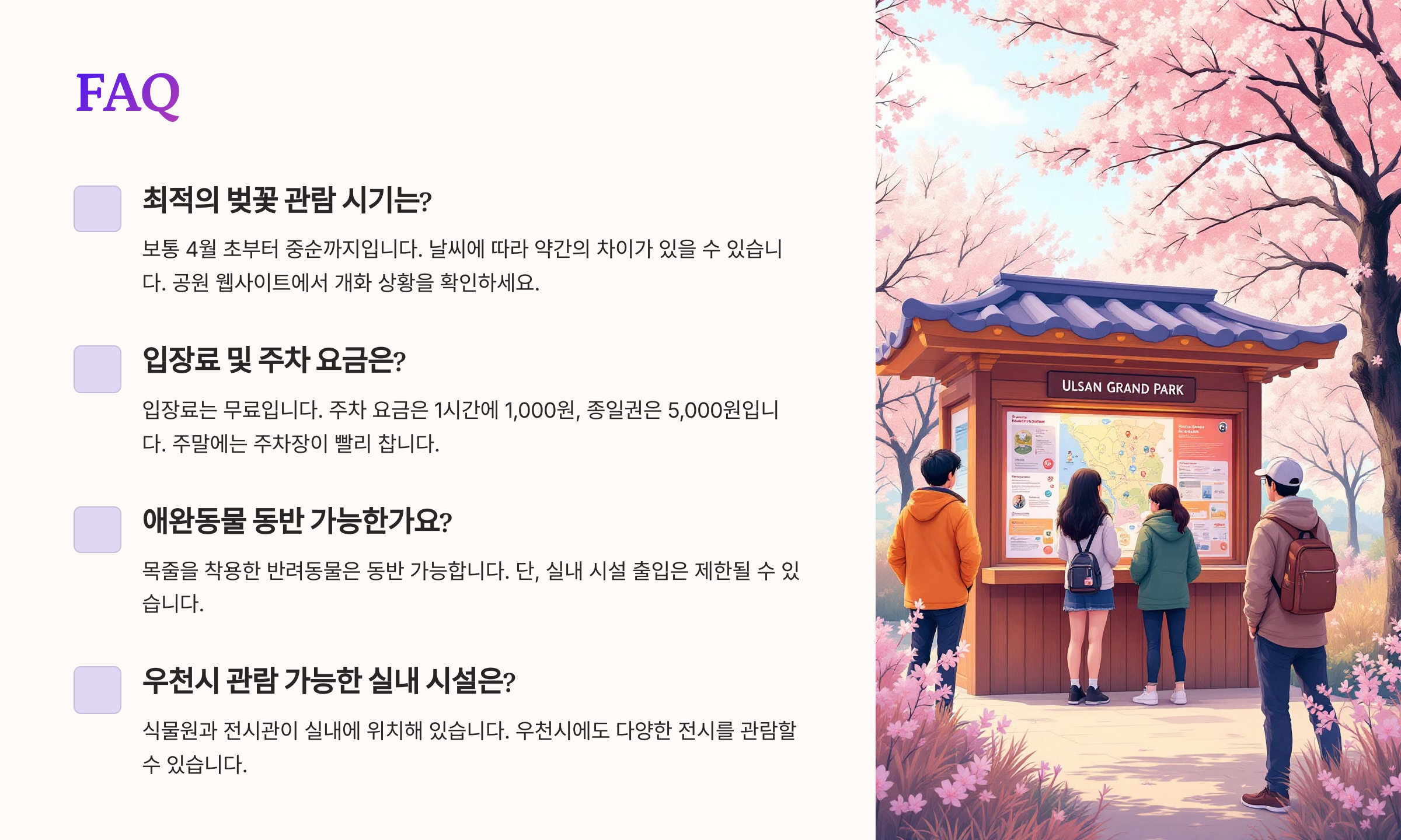 A1. 울산 대공원의 벚꽃은 보통 3월 말에서 4월 초 사이에 만개해요. 날씨에 따라 개화 시기가 달라질 수 있으니 기상청의 벚꽃 개화 예보를 확인하고 방문하는 것이 좋아요.