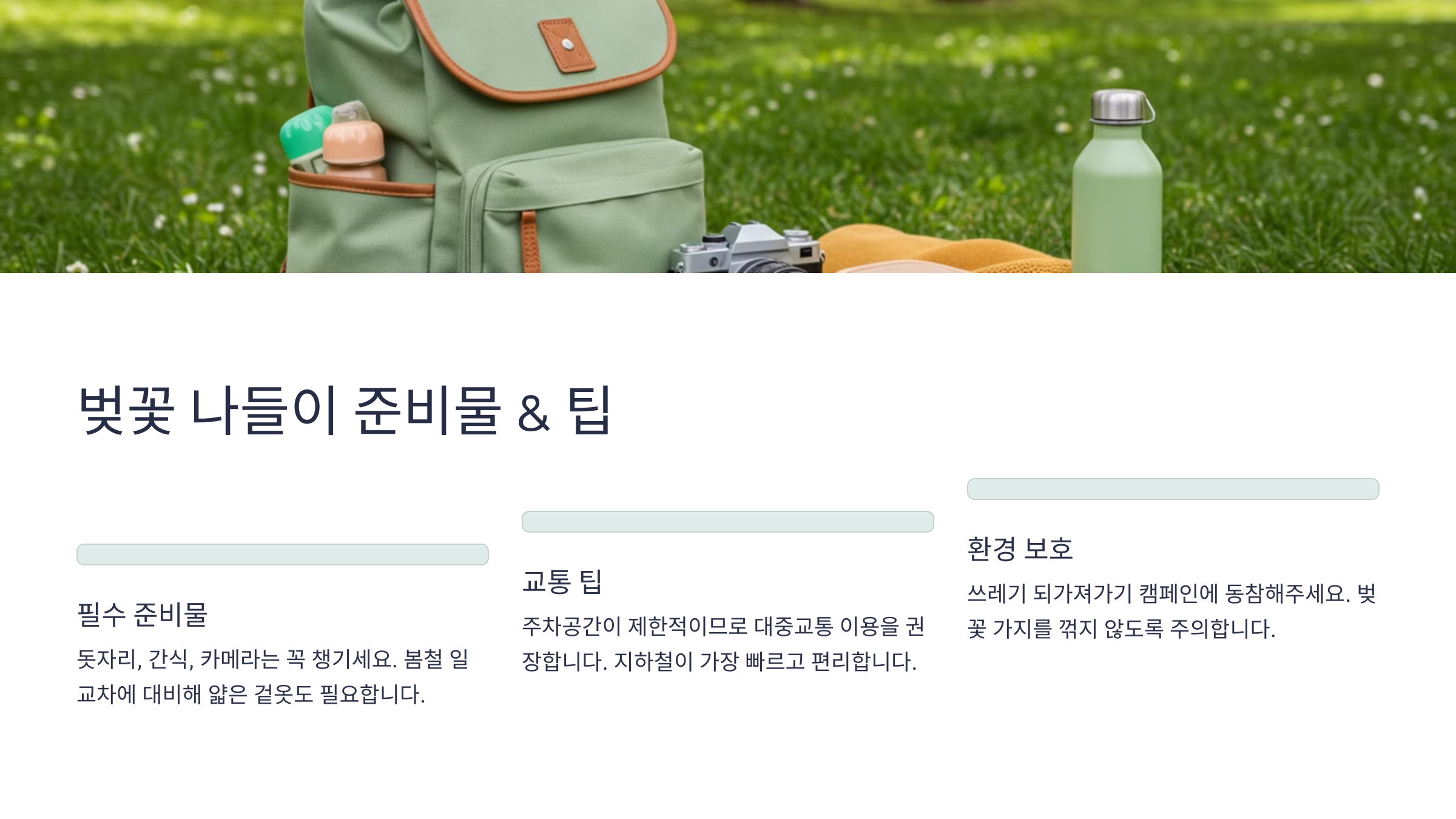 A8. 편안한 운동화, 돗자리, 카메라 또는 스마트폰, 가벼운 외투를 챙기면 좋아요. 벚꽃 시즌에는 바람이 불 수 있어 외투를 준비하는 것이 좋고, 돗자리를 깔고 피크닉을 즐기면 더욱 특별한 시간을 보낼 수 있어요.