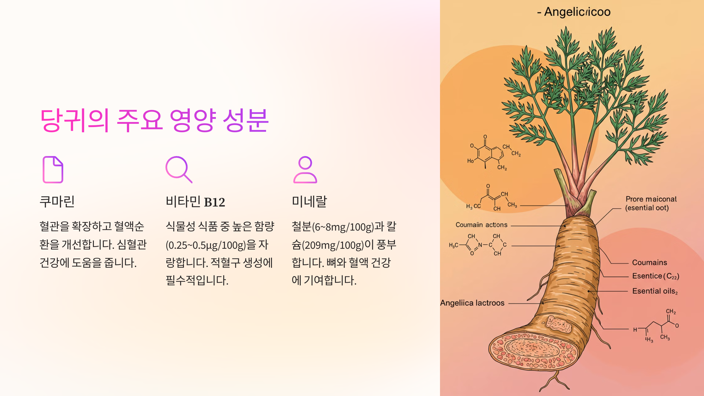 당귀에는 다양한 생리 활성 성분이 풍부하게 들어 있어요. 특히 혈액 순환을 촉진하는 '데쿠르신(decursin)'과 '데쿠르시놀(decursinol)'이 가장 중요한 성분으로 꼽혀요. 이들은 혈관을 확장시켜 혈류를 원활하게 해주는 역할을 하죠.