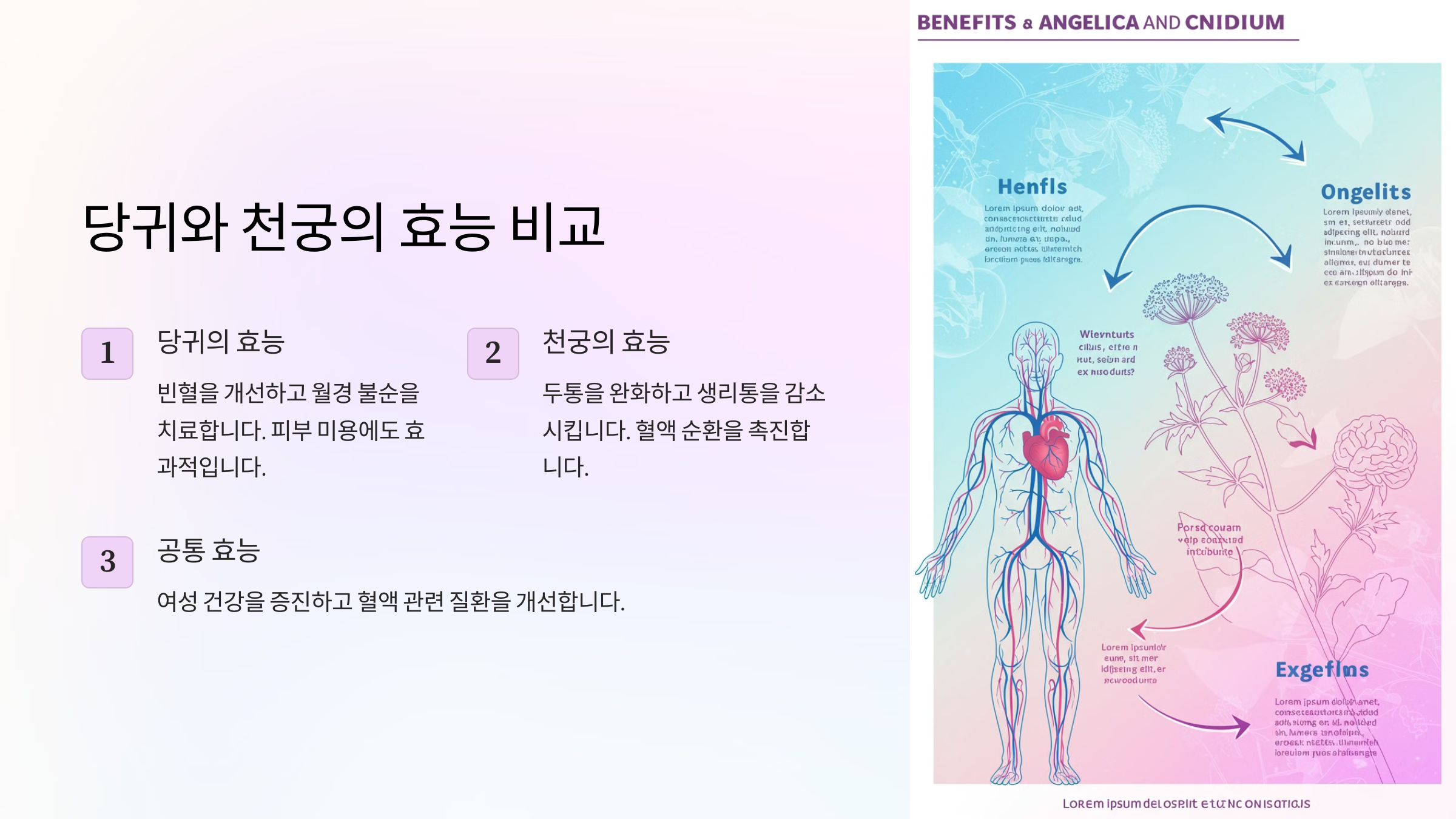 | 혈액 순환 개선 | 당귀는 혈을 보충하고, 천궁은 혈액의 흐름을 원활하게 함. |