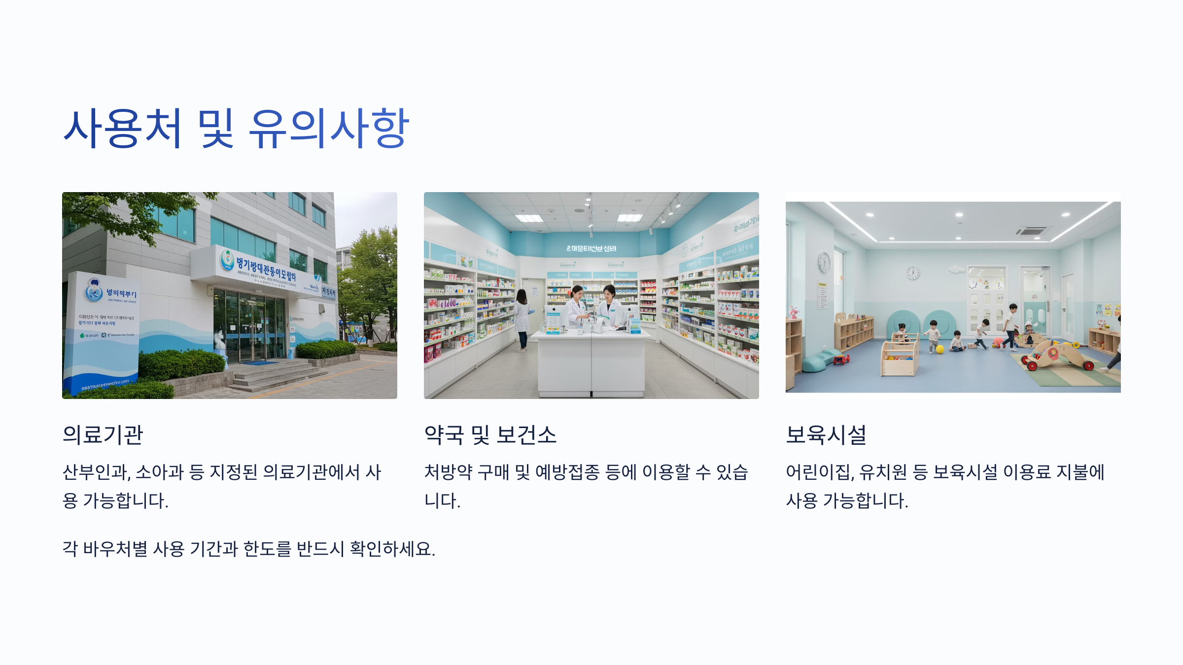 국민행복카드는 전국 다양한 의료기관, 약국, 어린이집, 유치원 등에서 사용할 수 있어요. 하지만 모든 곳에서 사용 가능한 것은 아니니 사용처를 미리 확인하는 것이 중요해요.