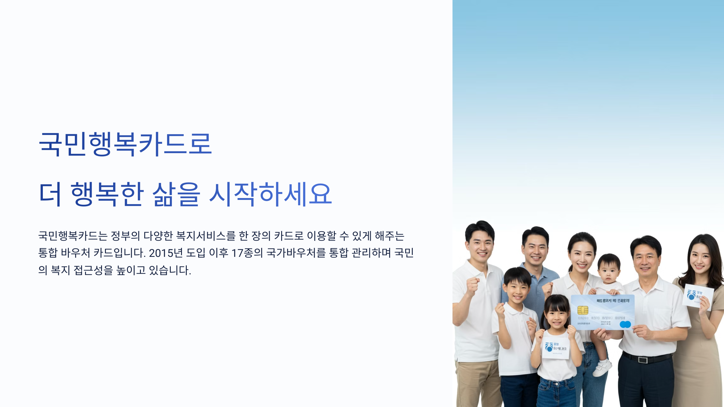 국민행복카드는 정부가 지원하는 복지 서비스들을 하나의 카드로 이용할 수 있도록 만든 복지카드예요. 이 카드 한 장이면 임신·출산 지원금, 보육료 지원, 의료비 할인 등 다양한 복지 혜택을 받을 수 있답니다.