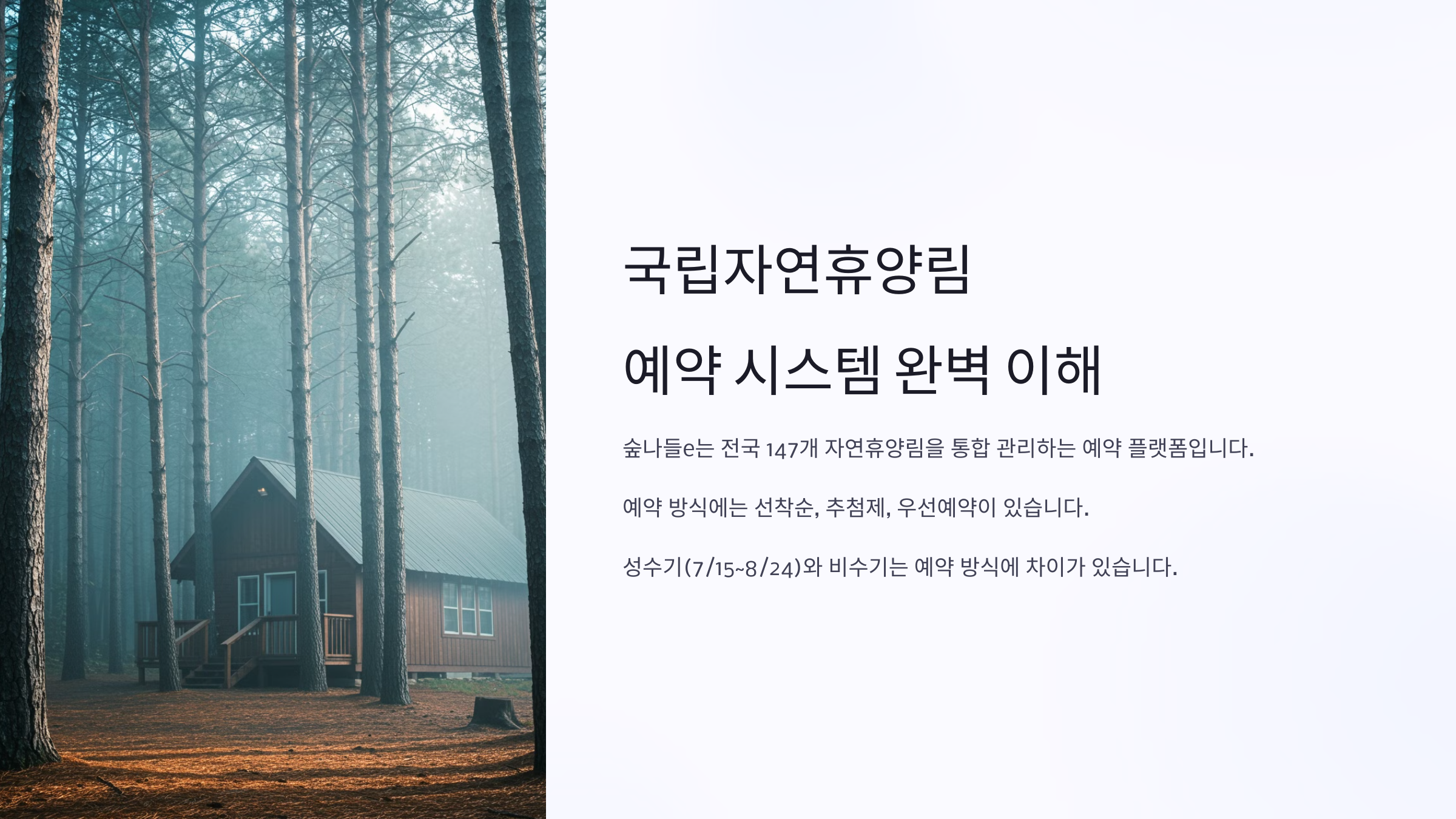 국립자연휴양림은 자연 속에서 힐링할 수 있는 최고의 숙소지만, 성수기나 주말에는 예약 경쟁이 치열해요. 인기 숙소는 몇 초 만에 마감되기 때문에 철저한 준비가 필요해요.