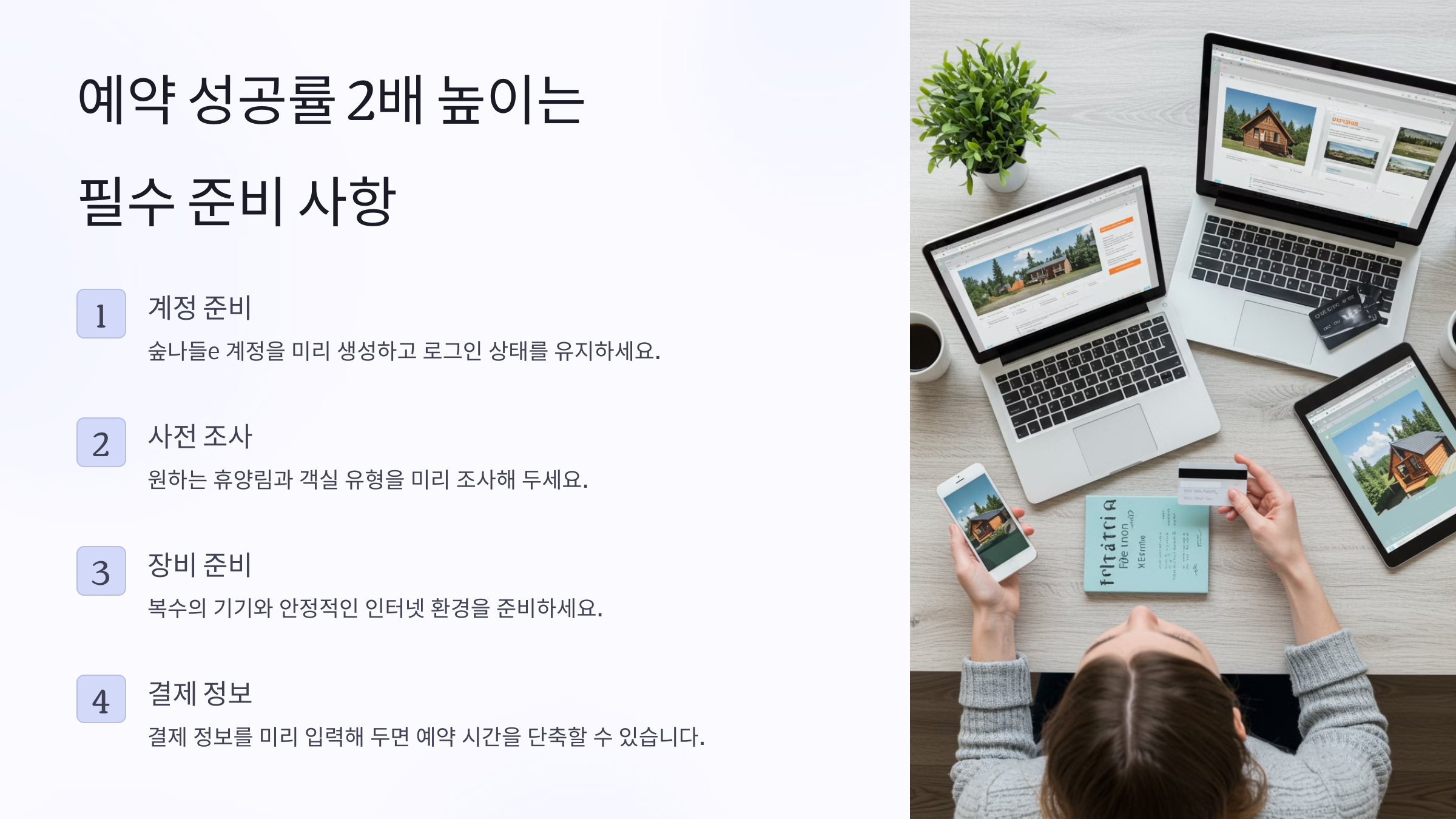 국립자연휴양림 예약은 1초 차이로 성공과 실패가 갈려요. 사전 준비를 철저히 하면 예약 성공 확률을 2배 이상 높일 수 있어요.