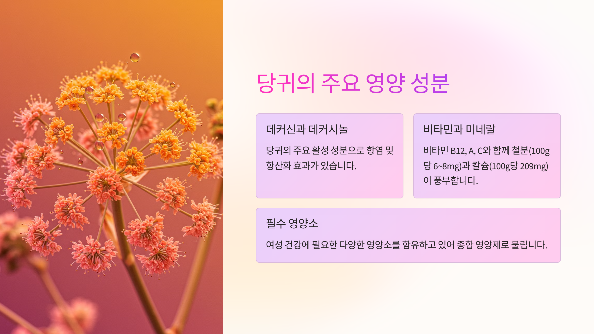 당귀에는 여성 건강에 도움이 되는 다양한 영양 성분이 포함되어 있어요. 대표적인 성분들을 알아볼까요?