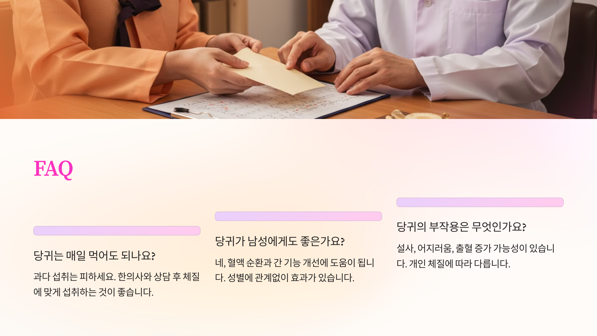 📢 마지막으로 당귀에 대한 자주 묻는 질문(FAQ)을 정리해볼게요! 👉 이제 다음 섹션 자동 출력! 다음 글에서는 당귀 섭취에 대한 궁금증을 해결해 줄 FAQ를 준비했어요. 😊