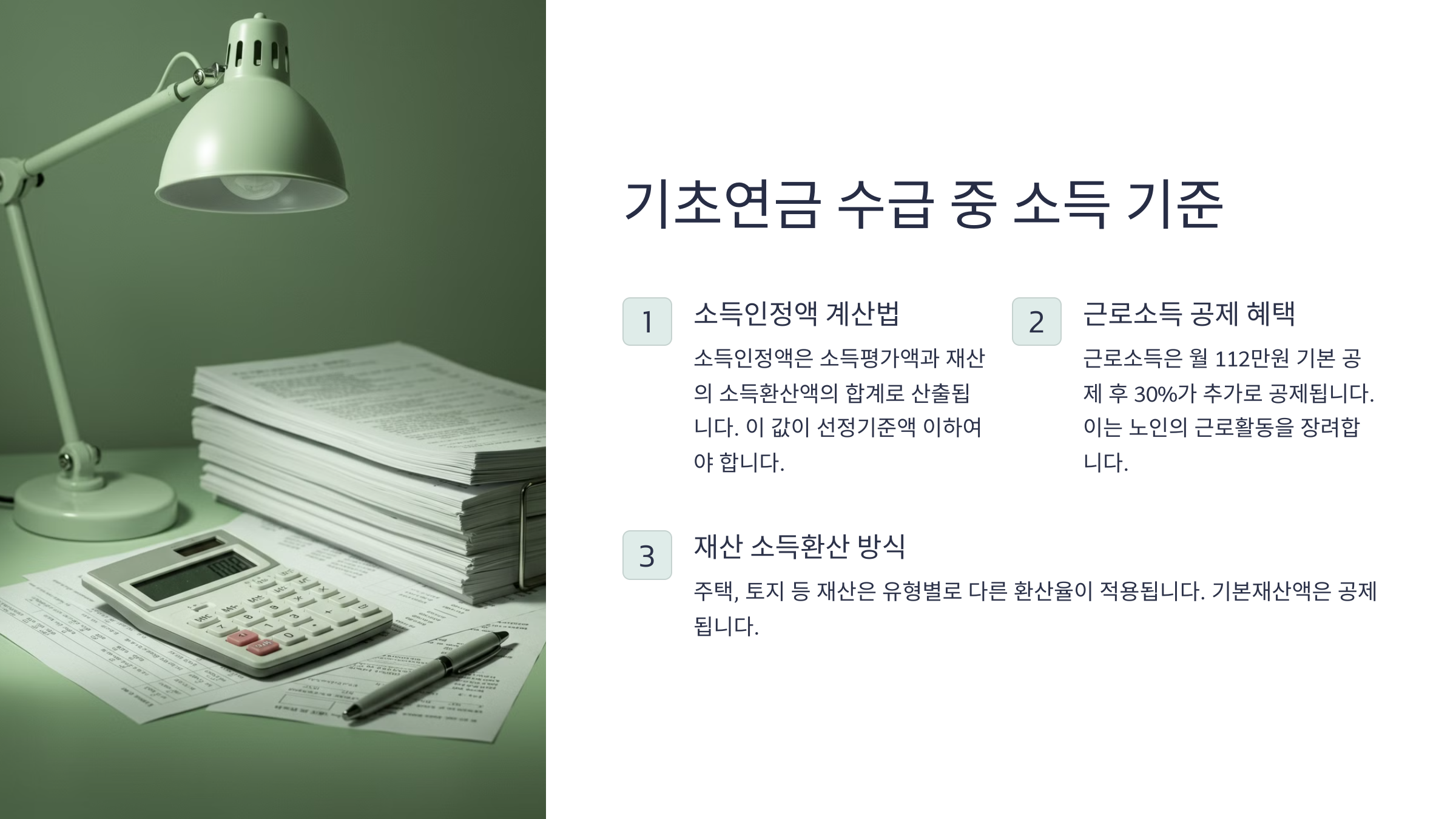 연금을 계속 받으려면 소득이 일정 기준을 초과하지 않아야 해요. 여기서 중요한 개념이 "소득인정액"인데요, 이는 단순히 월급만 포함하는 것이 아니라 재산과 금융 소득까지 합산해서 계산돼요. 📊