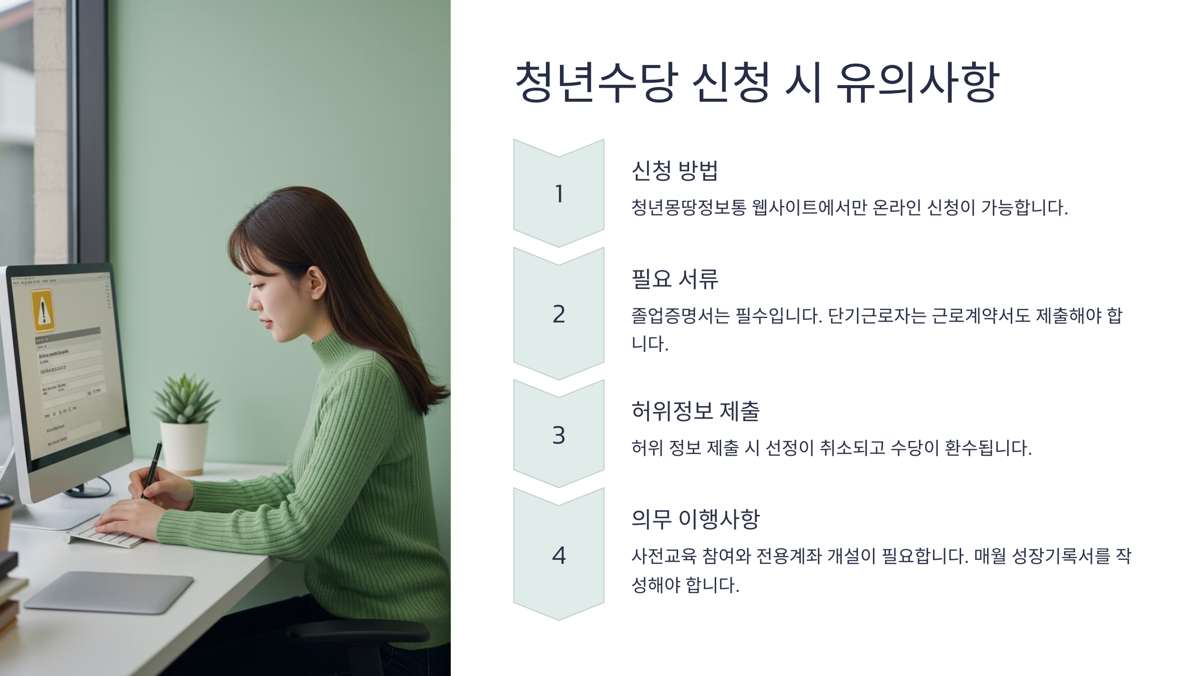 📢 다음 섹션에서는 청년수당 신청 시 유의할 점을 알아볼게요! ⚠️